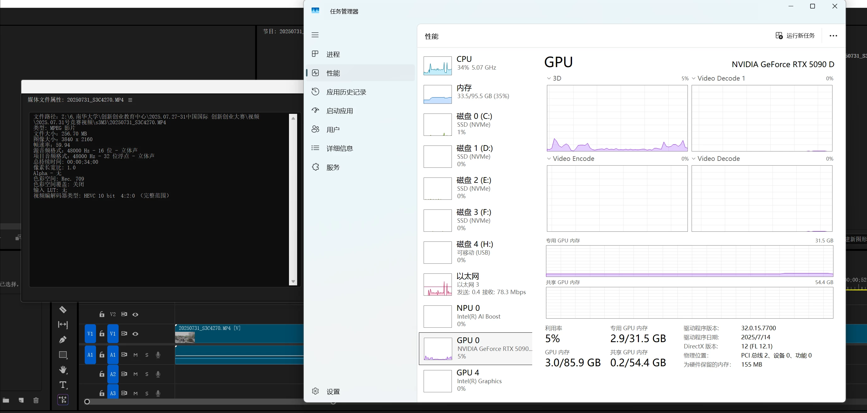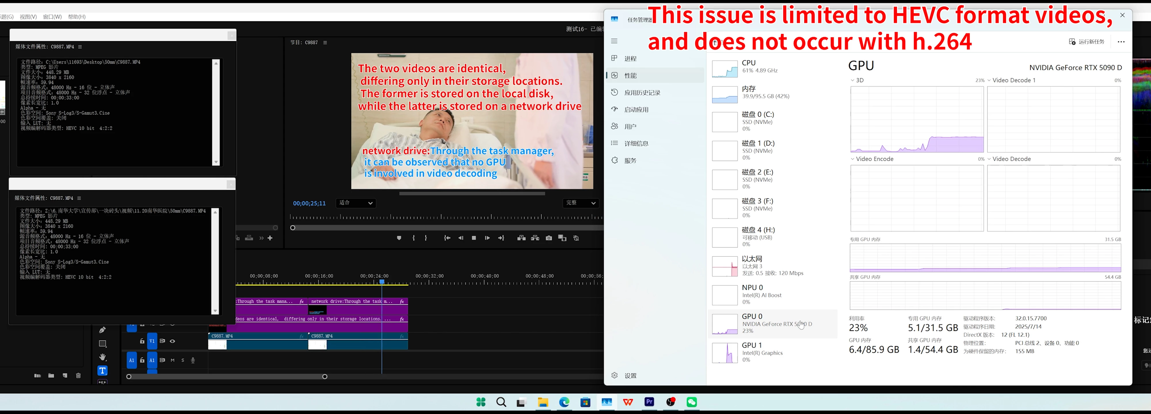 Starting from Premiere Pro v25.1, when video files encoded in HEVC 10-bit 4:2:0 or 4:2:2 are stored on a network drive, the software fails to utilize GPU hardware decoding, instead falling back to CPU decoding. This results in high CPU usage and degraded playback performance.