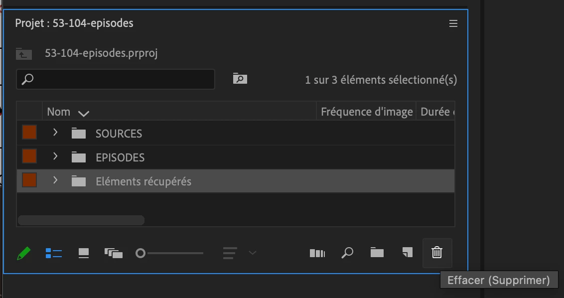 Depuis quelques jours, à chaque ouverture de mon projet Première, un chutier apparait, nommé "Elements récupérés" et contenant des éléments que j'avais précédemment supprimés. Il est créé automatiquement par Première