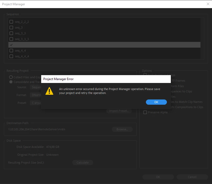"An unknown error occured during the Project Manager operation. Please save yout project and retry the operation"