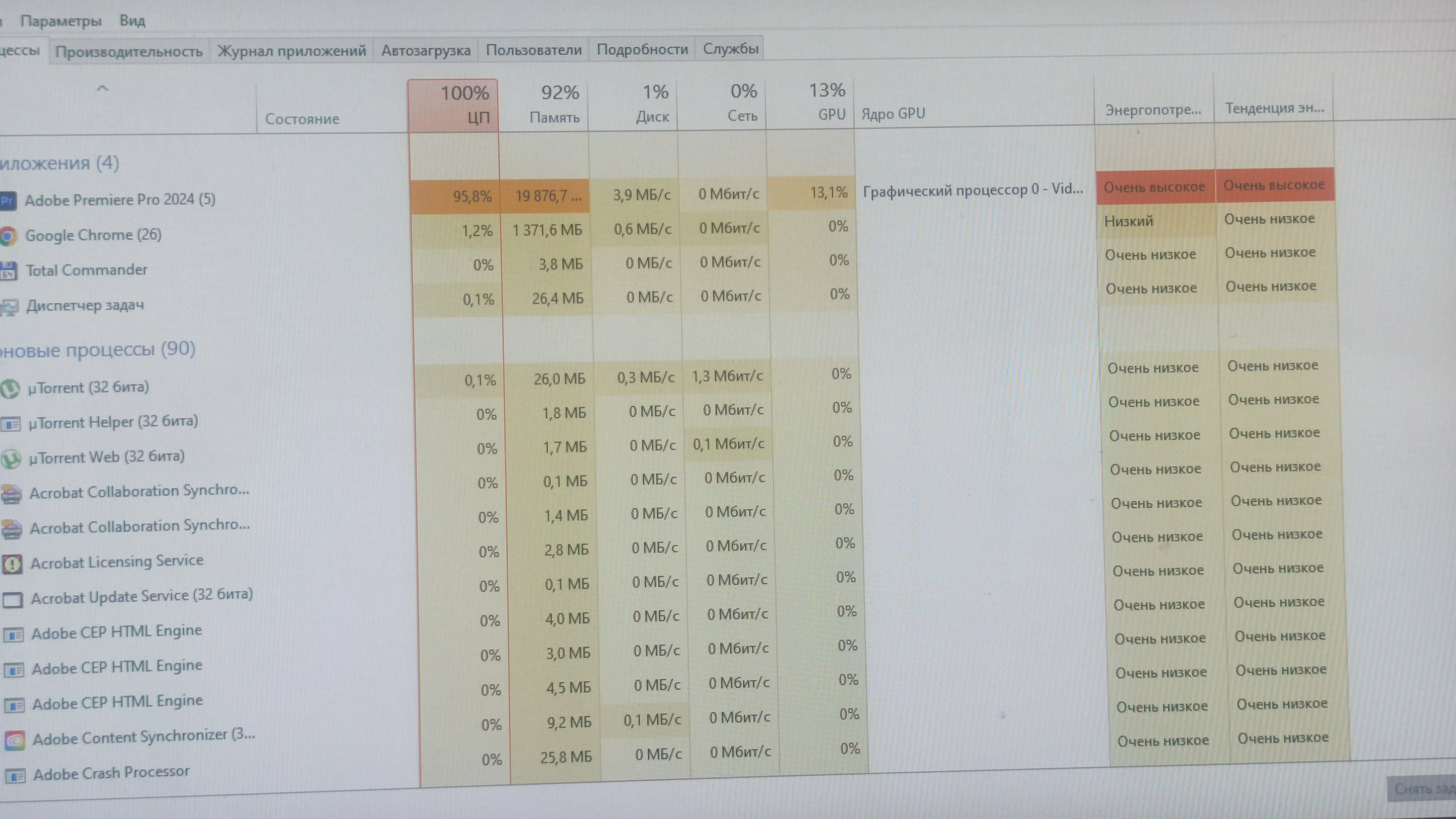Premier Pro 24 does not allow video export - the program starts to consume a lot of computer resources, there is a strong load on the processor and memory and the program closes. Windows 11, 26 GB of memory, a lot of free space, and in general the computer is quite powerful. I tried to export via Media Encoder - the same thing. I deleted the cache manually. What could be the reason?
