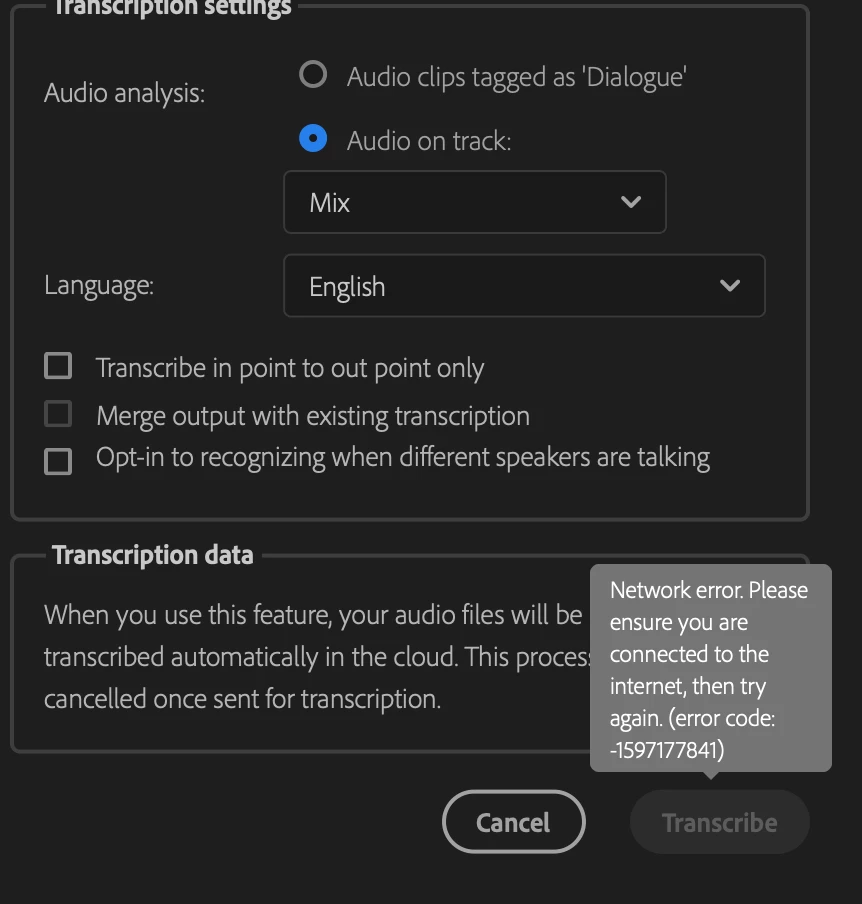 I am unable to use Transcribe sequence in Adobe Premiere Pro 2022 to create subtitles in my video. The error "Network error. Please ensure you are connected to the internet, then try again (error code: 1597177841)" appears and won't let me click the "Transcribe" button.
