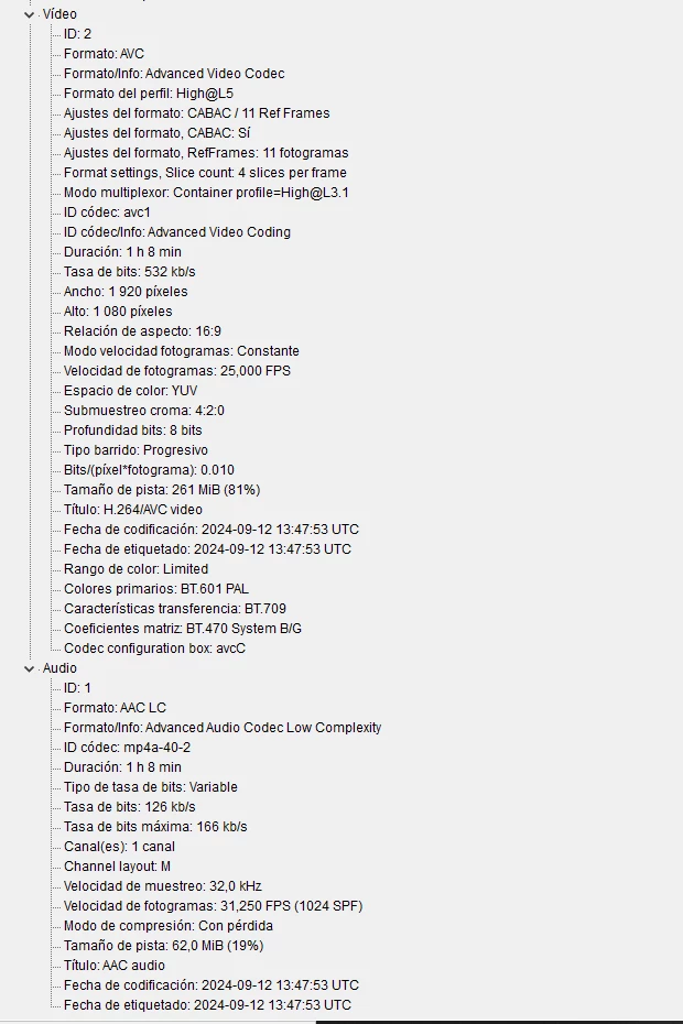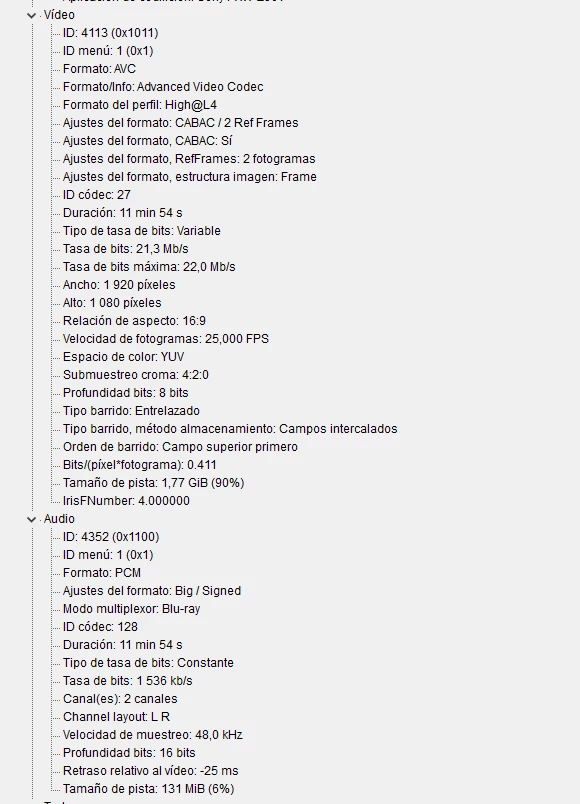 Adjunto captura de MediaInfo del otro clip, el que contiene audio + vídeo de referencia: