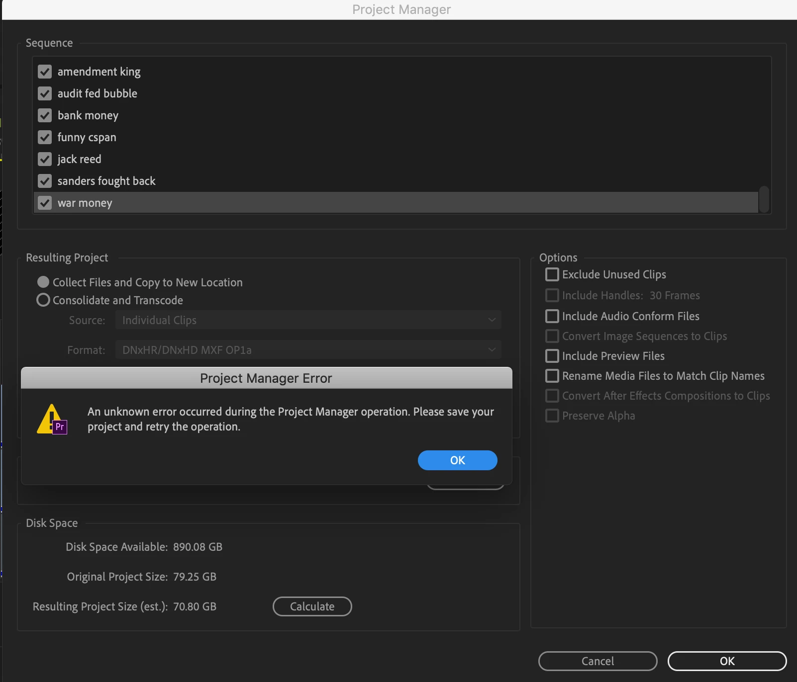 How my issue started: I have a pretty large project with tones of edits in them but I wanted to share just one edit with someone. When I went to use project manager for that one project it was still trying to add everything. So I just created a new project and sequence, then copied the project sequences I wanted in the new project and then closed the larger project. When I then tried to use project manager, I experienced the error message.