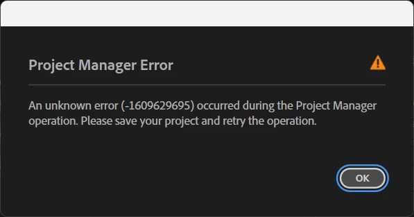 NNotZeroBut0ParticipantForum|Forum|8 months agoAugust 5, 2025QuestionProject Manager ErrorForum|Forum|8 months agoAugust 5, 20251 reply209 viewsProject Manager ErrorAn unknown error (-1609629695) occurred during the Project Manageroperation. Please save your project and retry the operation.OKEverytime I export a project, this error screen follows up after 100%.How toPerformanceExportHardware or GPUError or problem