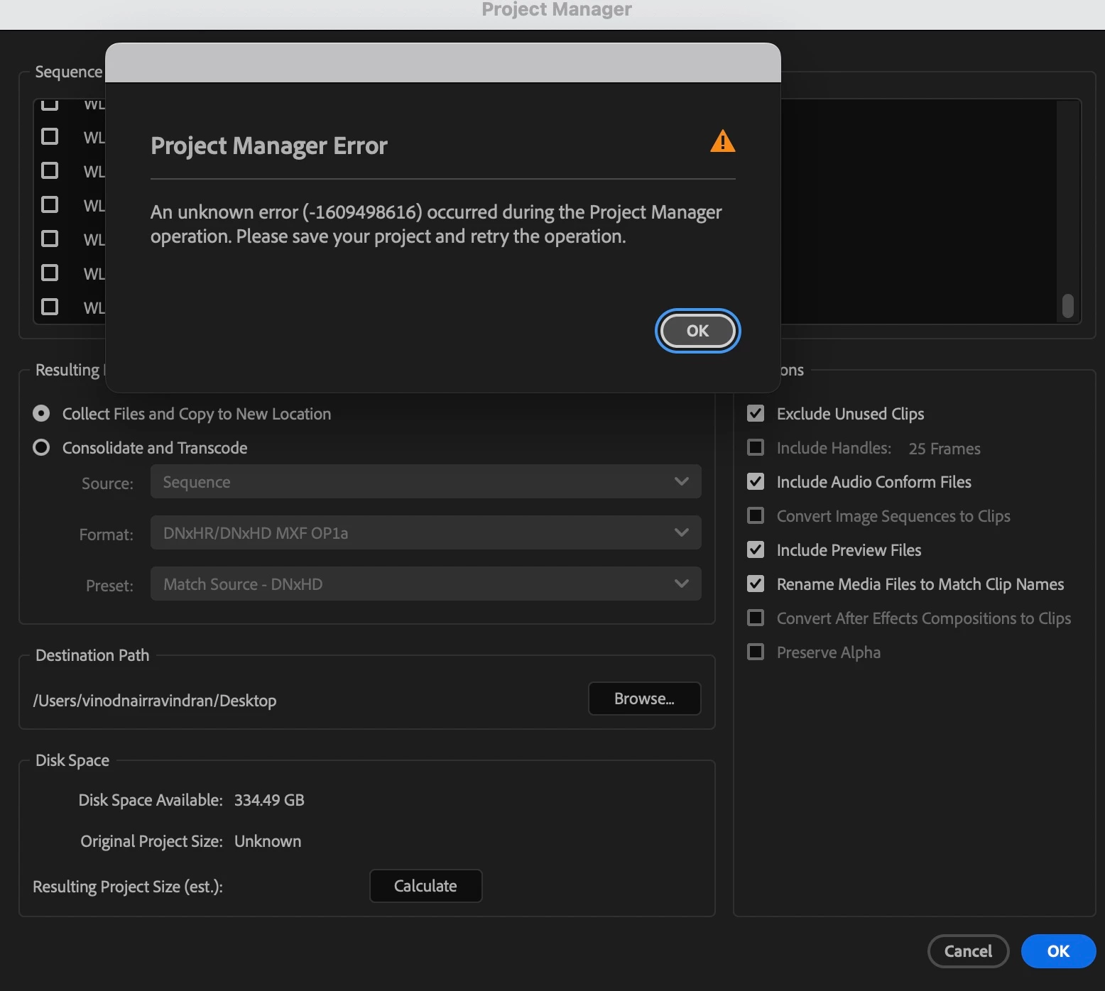 while trying to save the entire project... or even just ONE SINGLE SEQUENCE... I'm getting this Project Manager Error 1609498616 (screenshot enclosed) for Adobe PP 2025 version 25.1