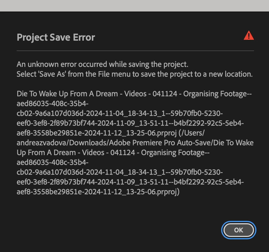 After I wanted the project to save it showed PROJECT SAVE ERROR and suggested as save as in another location. I did that and still the same.