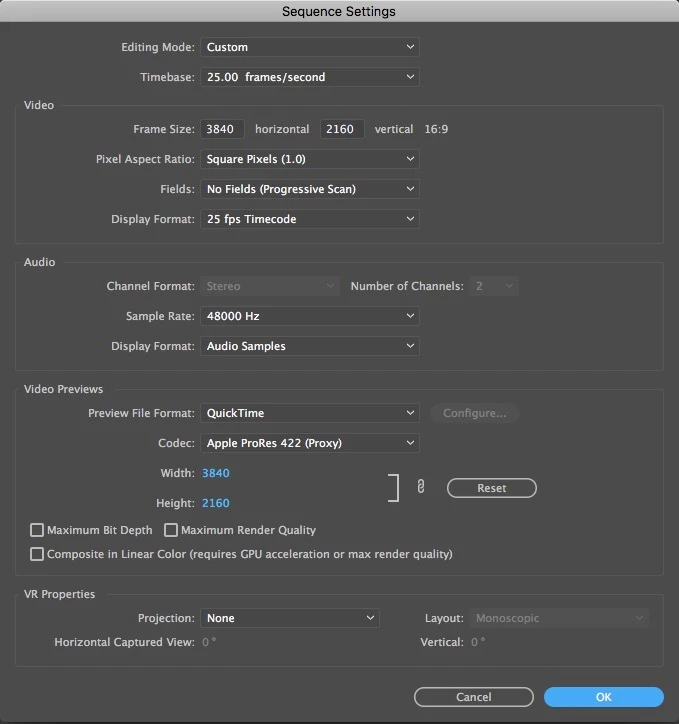 I've pulled a 4K Sony XAVC MXF to the timeline and then created a 1024 x 540 ProRes 422 (Proxy) file. Sequence is same as original media,