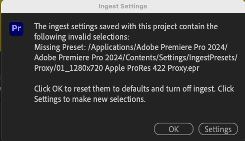 When I then bring them over to the MacStudio, the first thing that happens is it doesn't recognize my proxies - as if it's never heard of Apple ProRes 422 (1280 x 720). I generated those on the laptop with Media Encoder 2024 (version 24.1).
