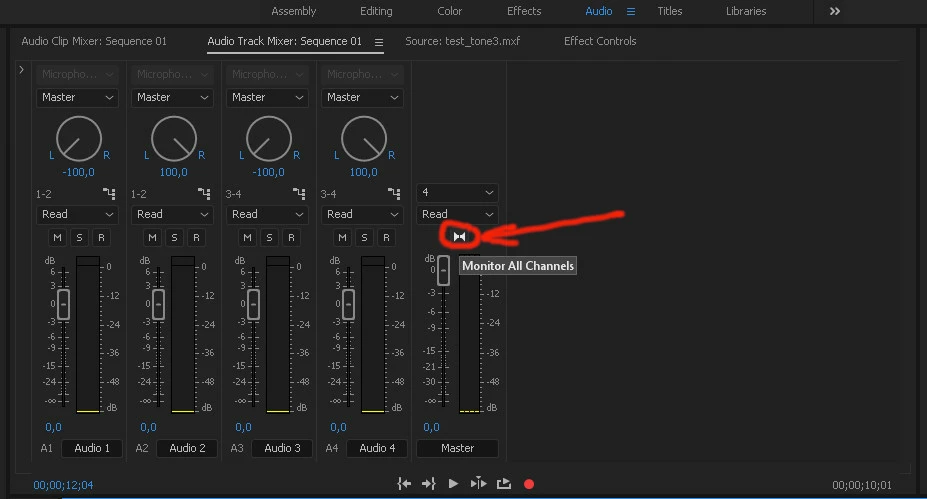 Try to hit the button "Monitor All Channels" in "Audio track mixer" window.