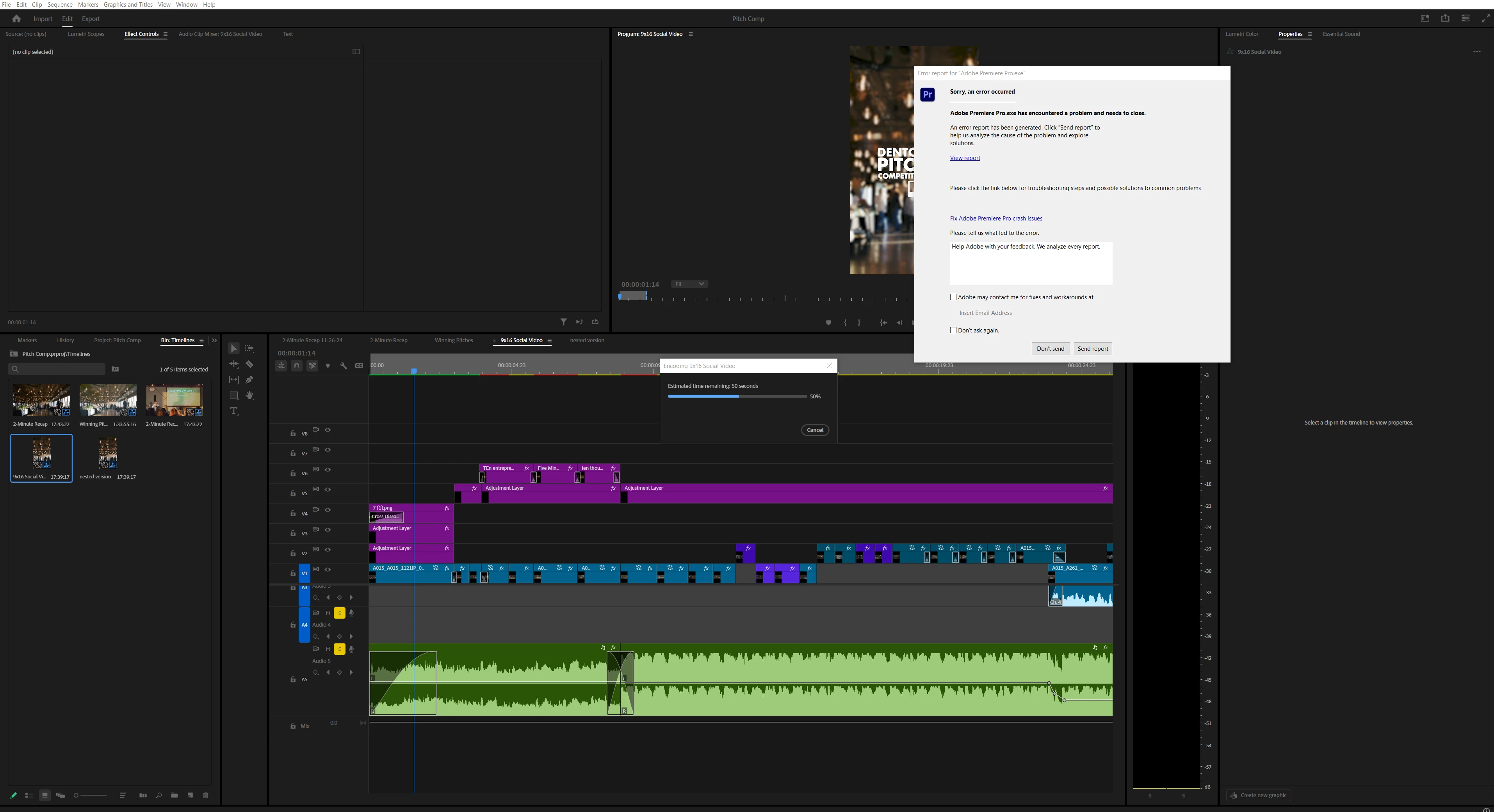 Attached is a sample of my timeline, nothing crazy. Couple text layers, an adjustment layer, clips and, music. Complexity of timeline has no effect on whether I crash or not.