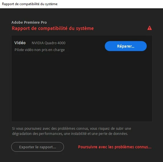 J'écris ce message car après plusieurs tentatives de téléchargements de drivers NVIDIA, quand j'ouvre Premiere Pro j'ai toujours cette fenêtre qui s'ouvre, ainsi mes exportations n'ont plus le même rendu que sur mon ancien ordinateur (un Macbook) et sont donc de moins bonne qualité. Que faire ?