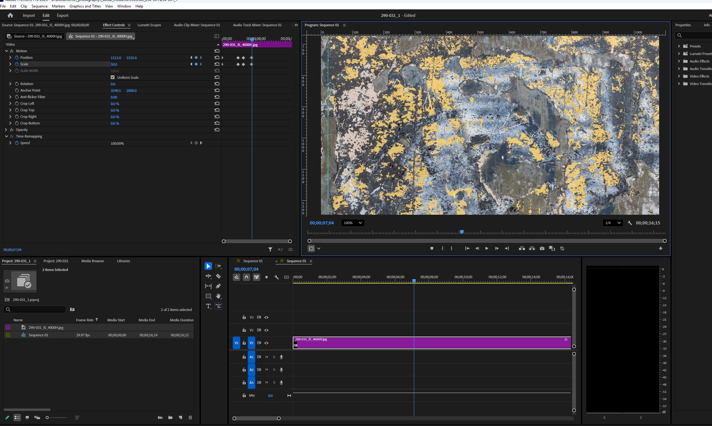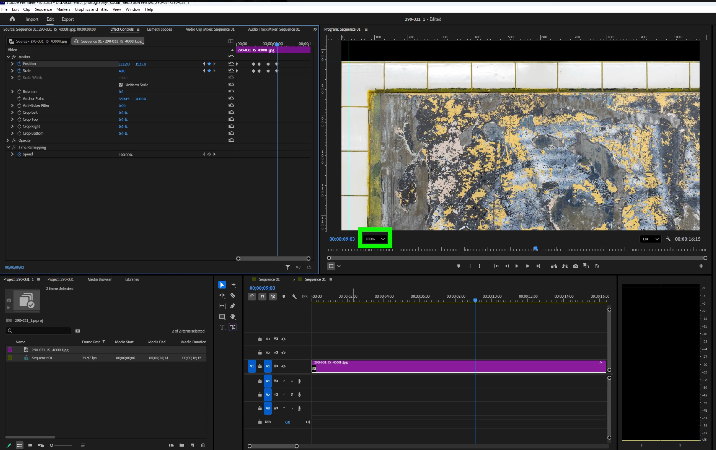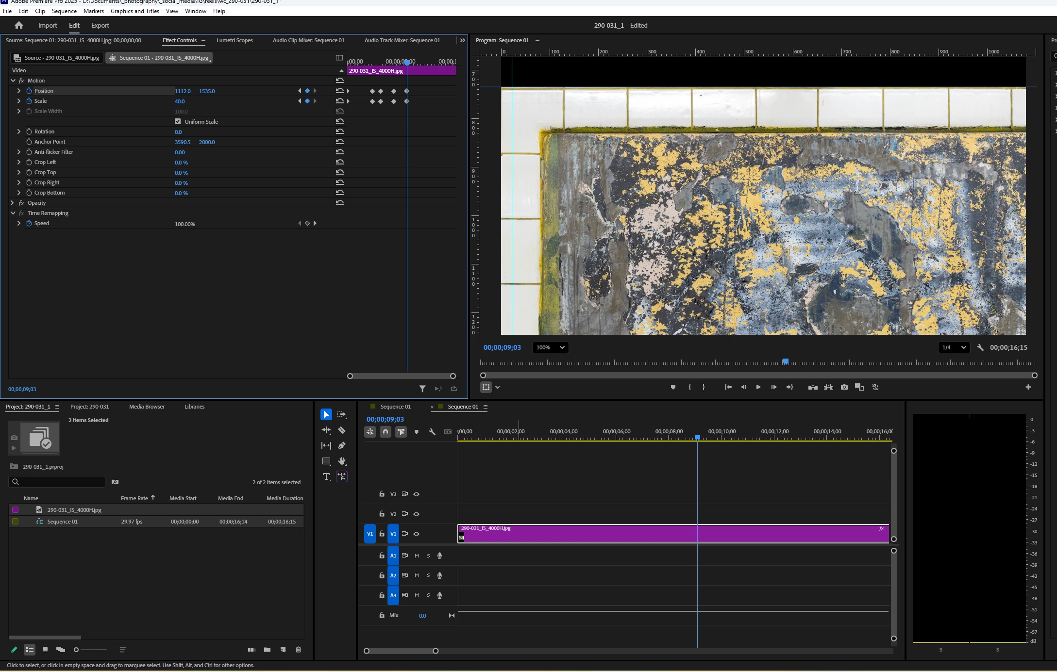 I double-clicked on the footage in the Program Monitor while the Selection Tool was active to see my motion path and anchor point, but they're not showing up. Why? I want to zoom out slightly while centered - and in my 2d screenshot have reset Scale from 50% to 40% - but how do I recalculate my anchor point so that it's at the center of the previous keyframe? In other words, between the last 2 sets of keyframes, I only want to scale - not pan L to R or up and down. In the 2d screenshot, the image has drifted up towards the left top of frame. I don't want that. Thanks for your help!