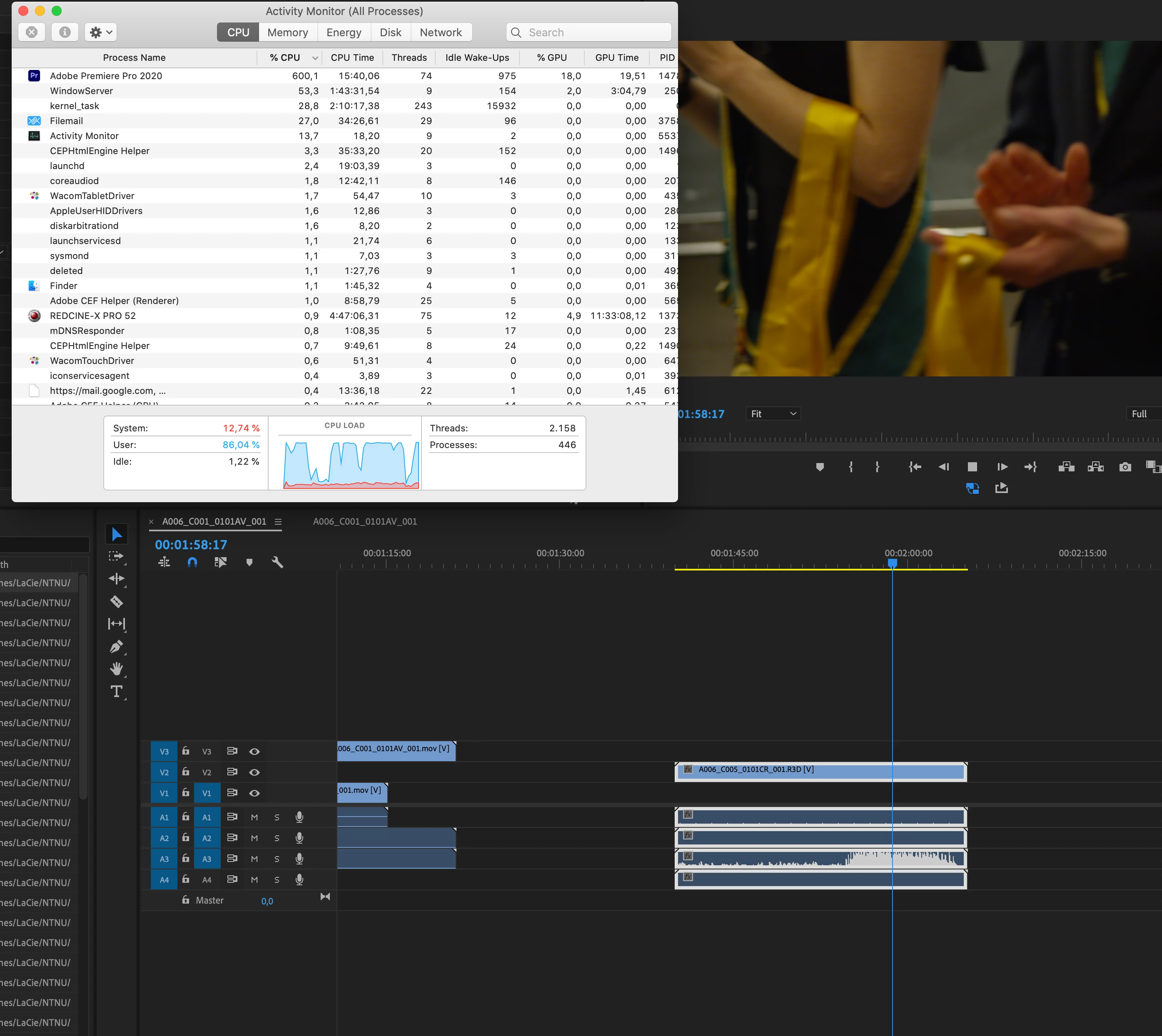 I'm on a iMac (2017) 4,2 ghz i7, 40gb ram, Catalina. All software is updated. See screenshot of cpu usage while doing playback of RED footage. When switching to Prores 4k the computer can cope just fine goes, typicall at 200% cpu when playing back in full quality.