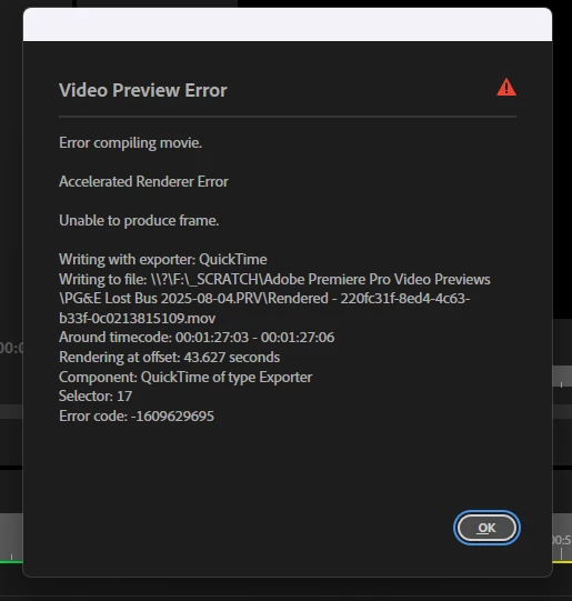 When exporting timelines with R3D files from either Premiere Pro or Media Encoder (in any version of Premiere Pro 25) to h.264 encodes, the export will stall indefinitely. Attempting to cancel the export will crash either program completely. Attempting to render timelines will break the codec completely, turning all video previews in any window black, only returning on restarting the program.