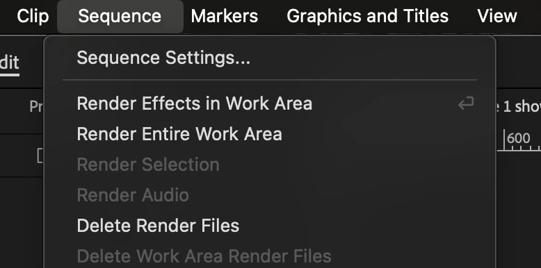 In order to render now I have to go to the Sequence menu and select "Render Entire Work Area".
