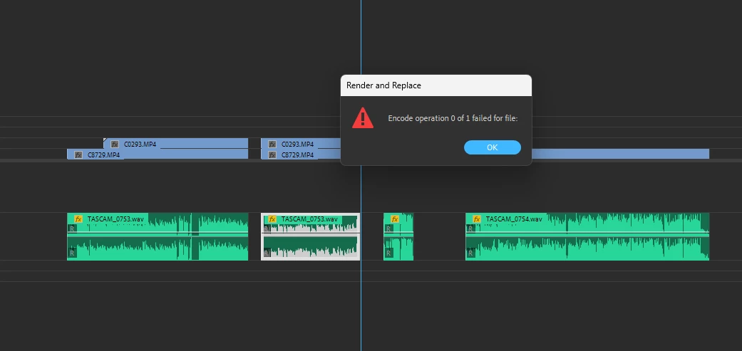 When I try to Render and Replace an audio file, I get the error "Encoding operation 0 of 1 failed for file:".