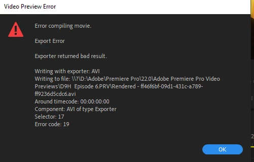 I couldn't render my timeline, called support and they reset my sequence settings to mirosoft avi, and it worked once, I can get it to render by using the cineform setting or quicktime but after rendering the video it's choppy and laggy, tried just rendering a single clip from a samsung phone (mp4) and it wouldn't work either, I have had zero trouble until all of a sudden it no longer worked, I can take the same gopro video and open it in elements and render it with no issues. when trying to render with the avi setting I get the error code that everyone quotes on here, but it starts at 0:000 and it doesn't matter if you delete that clip or any other you'll get the same error code until I change the setting in the sequence settings (video preview) I have included a screen shot of the sequence settings, is there something I'm not seeing or setting correctly. also everytime I start a new project it is set for microsoft avi