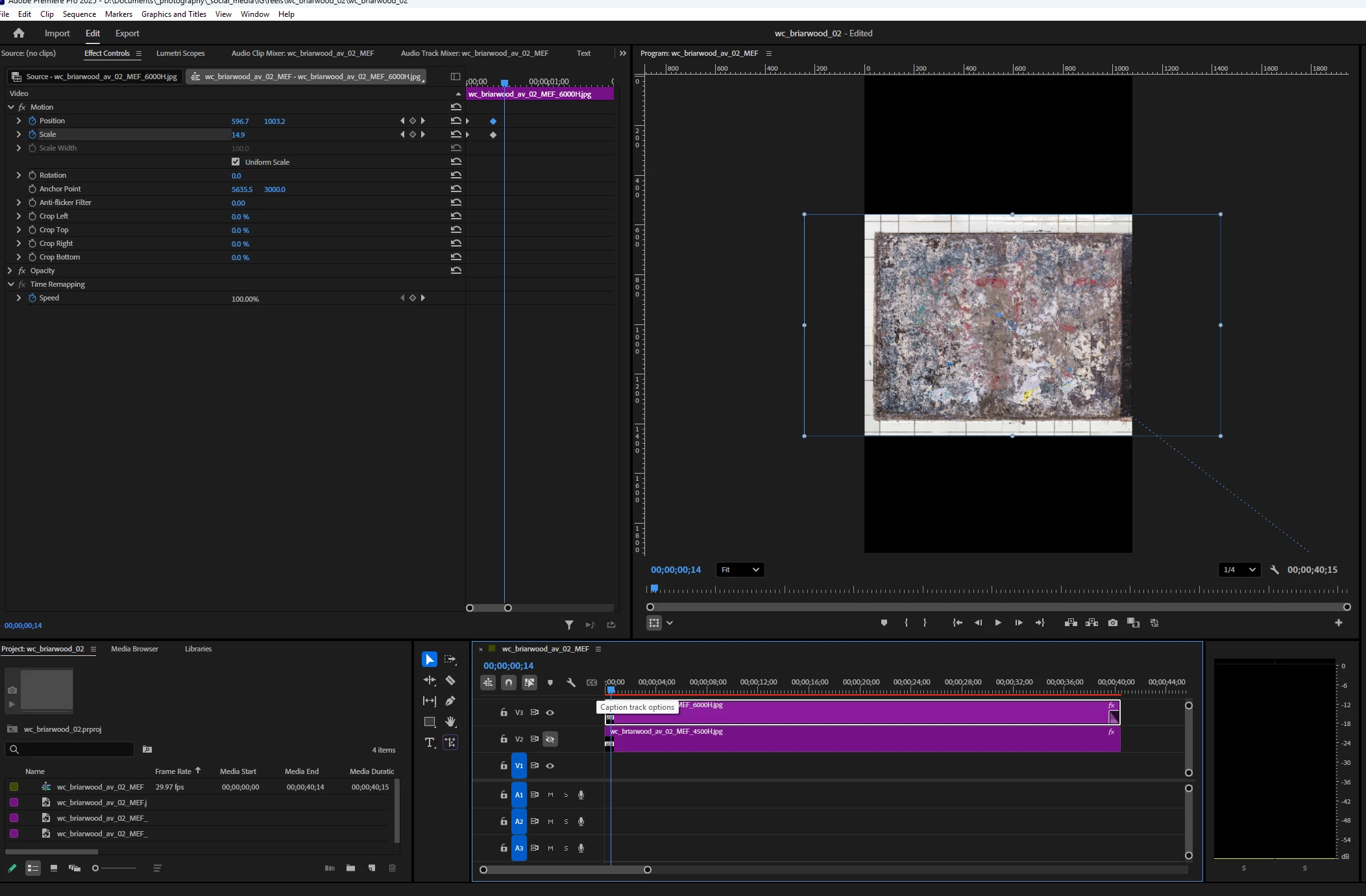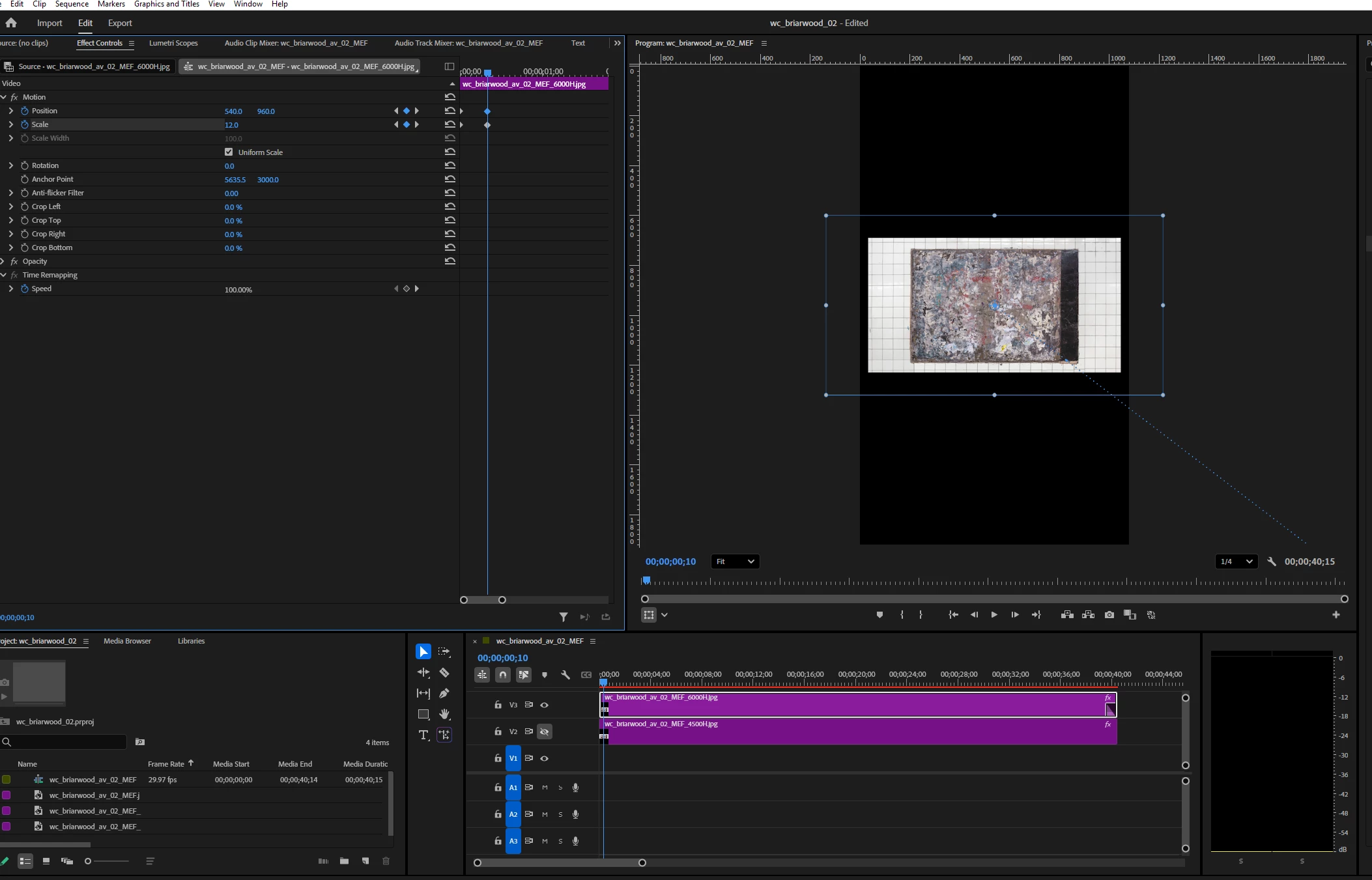 I have a still image I am animating and even though I have changed Scale between the 1st 2 sets of keyframes, the image is not animating there. The 1st screenshot shows the video at its start, with a Scale of 9. Screenshot 2 shows the video at the next set of keyframes, and there is no change, despite the Scale having been set to 12. I noticed that the Position keyframe is blue here, the only keyframe that is not white in the video. I also noticed that the frame around the image in the Program Monitor with the handles has changed even though the image hasn't. I assume both these things may provide clues as to what's happening here. Screenshot 3 shows the Timeline just after the 2nd set of keyframes, with the image finally "moving." Any help would be appreciated. Thanks.