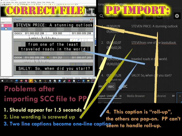 I tried discussing this with a customer rep, but he kept telling me that Adobe couldn't help me with my captioning software. I told him, with respect, that my software has nothing to do with it. I know my scc files are correct -- if they weren't, I would have been out of business years ago, especially since the timing of cap files has to be frame-perfect in places (for instance, at certain shot changes).