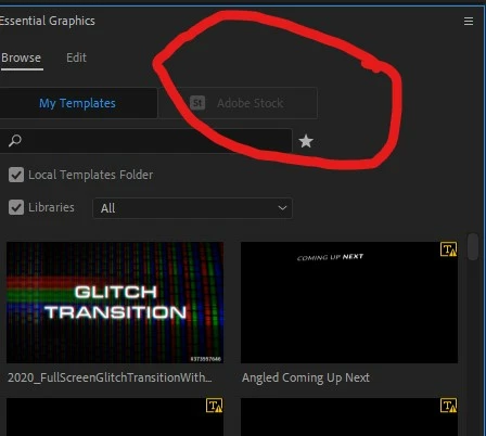 I am relatively new to Premiere Pro, and I am mostly self taught aside from a view youtube videos here and there. Last week I was able to search Adobe Stock for templates via the essential grapics panel, however this week adobe stock is grayed out. I am not sure if it is something I have done accidental or something adobe has done in an update. I am still learning to make my titles, and AE is still quite alien to me so at this time making my own is huge project of it own right.