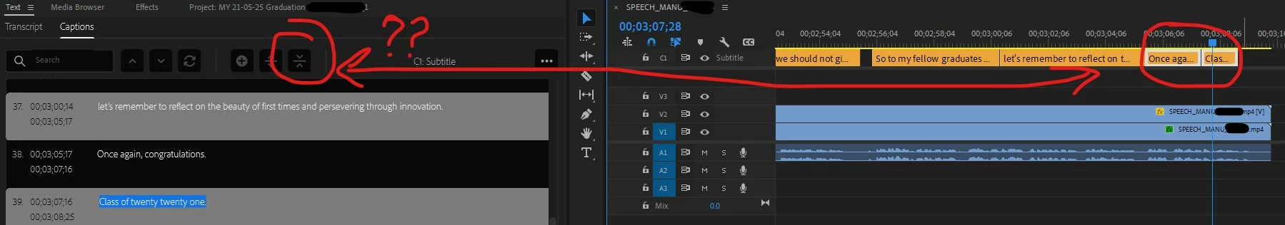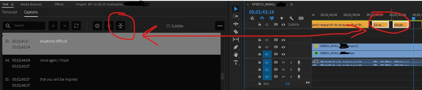 As the auto subtitle feature tends to chop the transcript into extremely small blocks - sometimes only two or three words long - it's necessary to go through the sequence and merge caption blocks to get the desired amount of text on screen. Normally not a problem. I select the blocks I want in the timeline and then select the 'merge captions' button in the text panel as seen below: