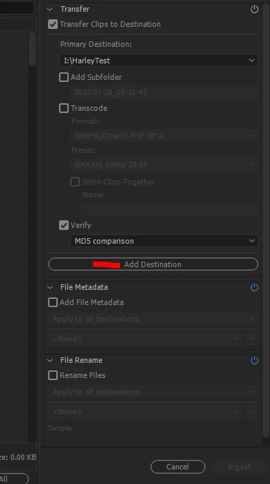 I am trying to ingest to a backup location but find NO "Add Deistination" bar in the latest version of Prelude. It also won't let me set my network server as the destination. Please advise.