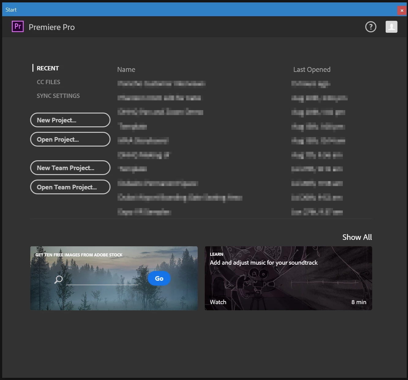 I recently noticed a strange discrepancy when using my wife's Adobe account from home a couple of days ago. On her account, Premiere (and other apps), have a better Start Screen than the one I have with my work account.