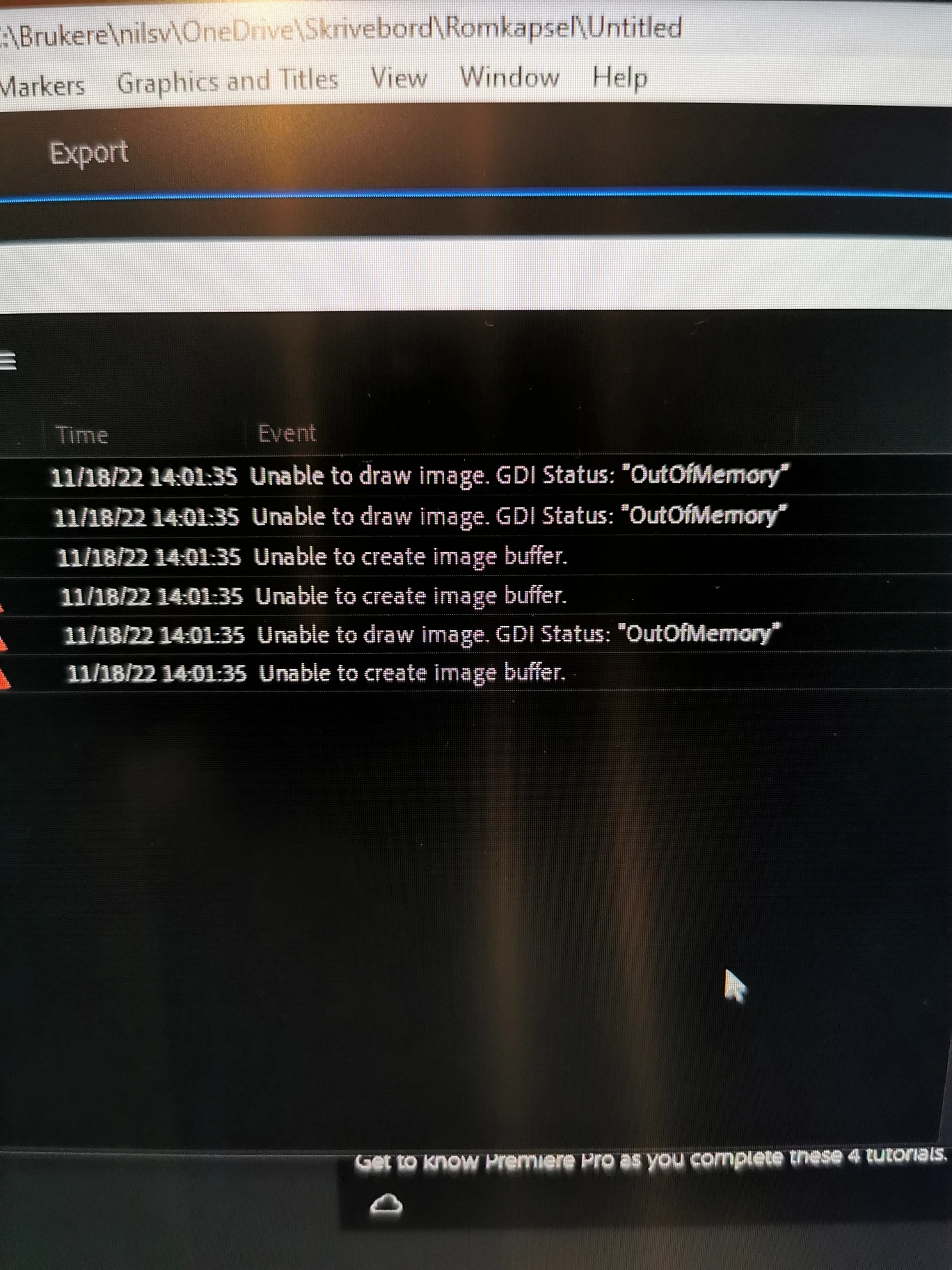 To start of: I have tried deleting my media cache. I have reinstalled Premiere Pro several times, and I have enabeled auto save to Cloud. STILL I get the warning every time I start up PP "Running Low on memory". Also I get "unable to draw image. GDI Status "Out of memory". PP moans about not beeing able to create image buffer, and I get a bunch of low level exeptions with "ImporterMPEG(importer 39) and Importer 81"