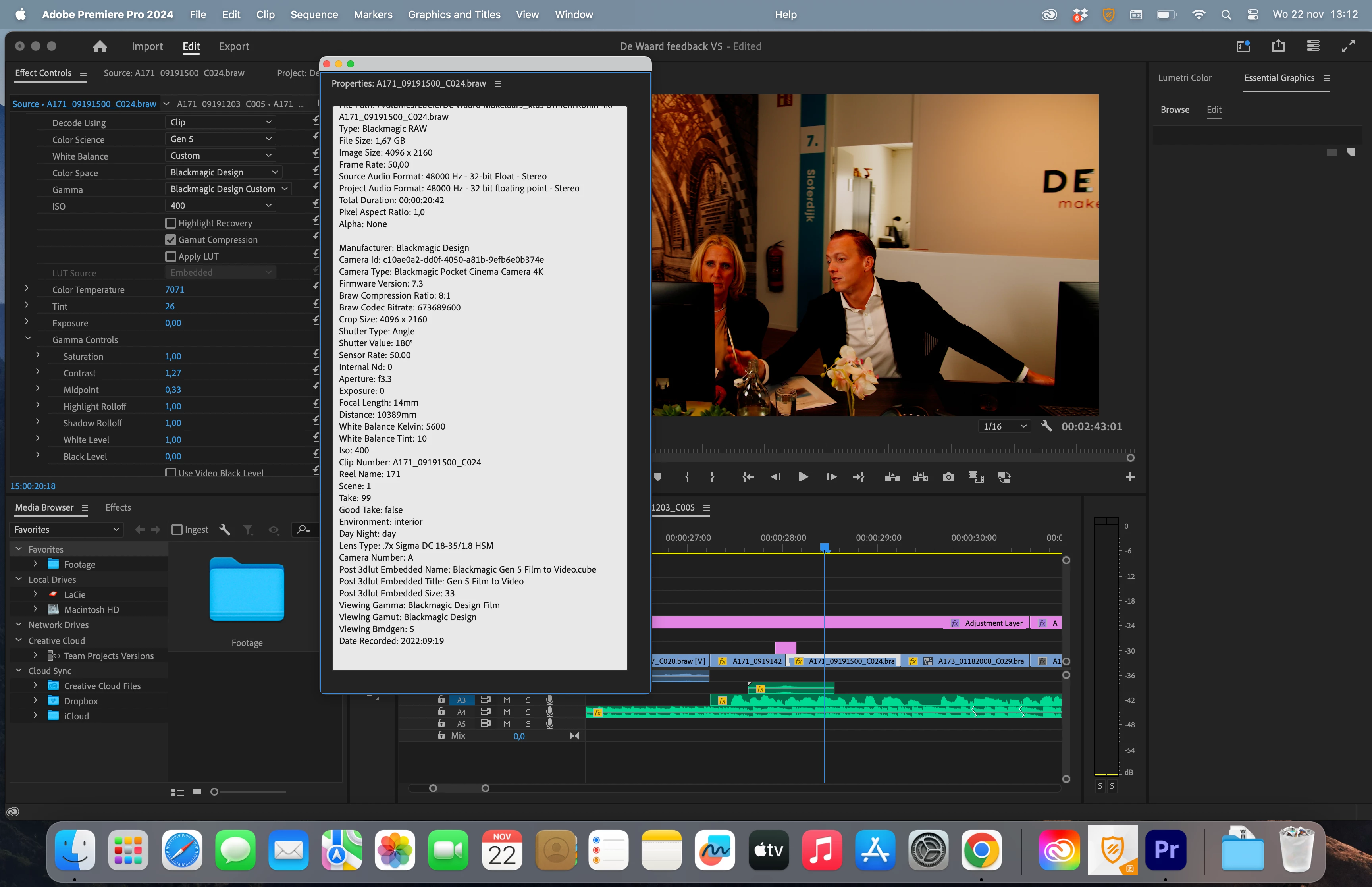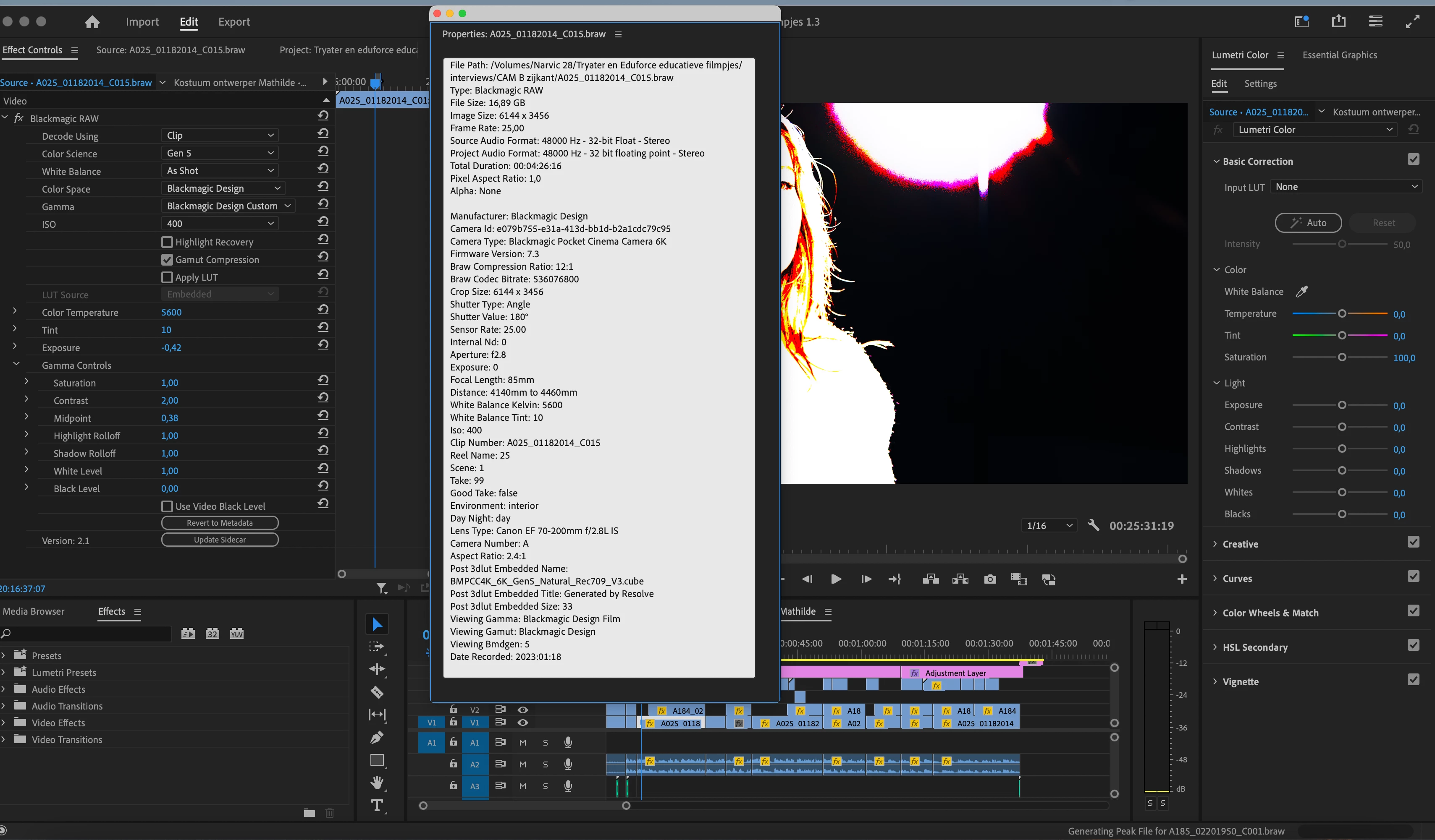 Now, when I want to edit my project (which I had already worked on on my previous Intel Macbook) I experience many issues with Braw. It changes the White balance and other settings in braw automatically sometimes. And it is ‘generating peak files’ constantly. I short, I notice the workflow is difficult and I notice that the program needs to work very hard because something isn’t correct inside and I don’t know what it is.
