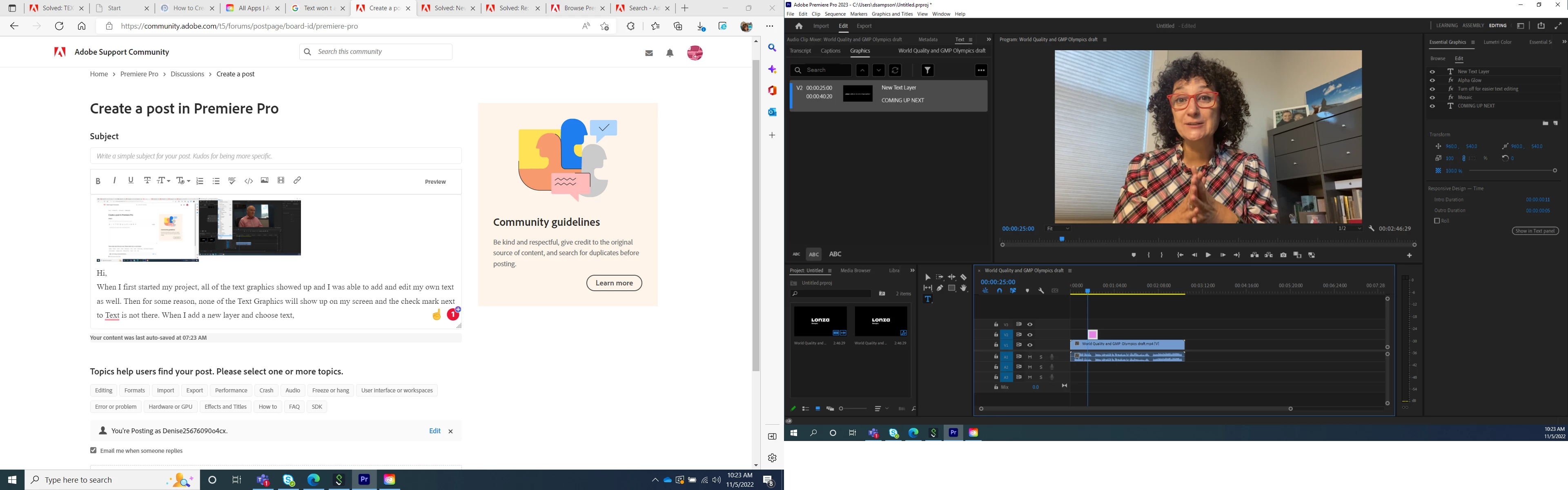 When I first started my project, all of the text graphics showed up and I was able to add and edit my own text as well. Then for some reason, none of the Text Graphics will show up on my screen and the check mark next to Text is not there. When I add a new layer and choose text, it shows up on the right, but will not show up in my view screen. What is going on? can anyone help?