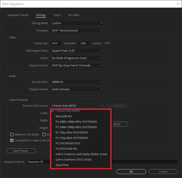 The choice of "Preview File Format" in "Sequence Settings"