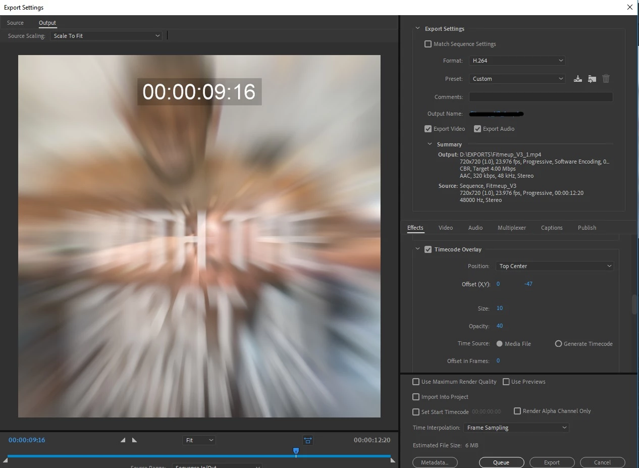 The timecode effect settings are: SMPTE, source set to Generate, frame rate matching sequence frame-rate (25fps). This is simply to give me composer a visual TC reference on my exported videos, which corresponds to my sequence timeline.