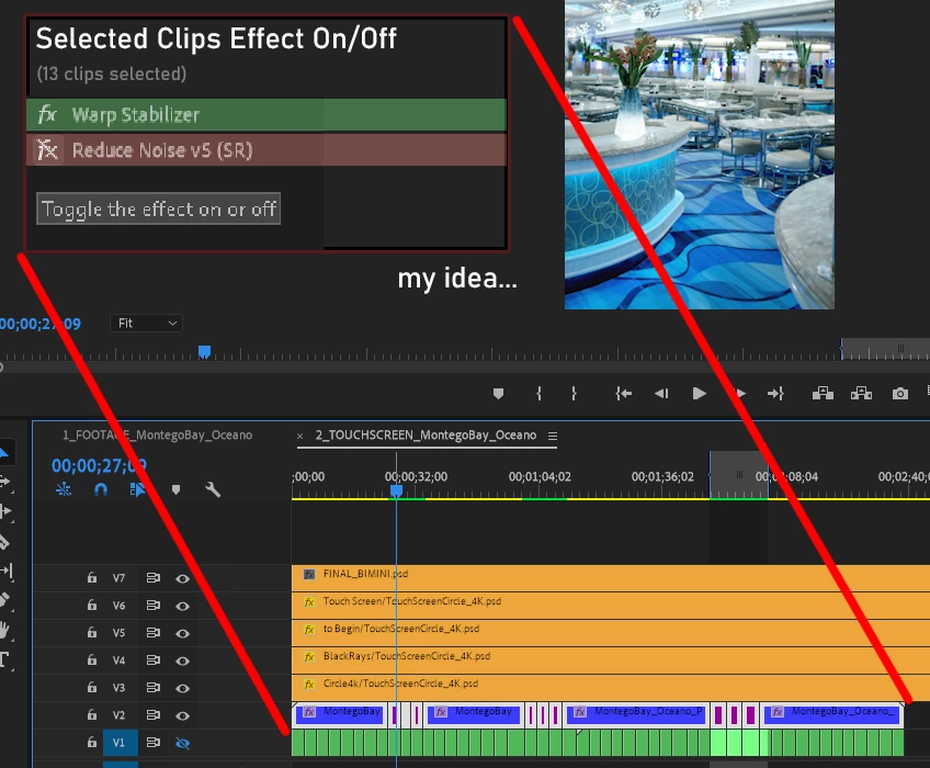Hello I use premiere professional for 20+ years, I do massive edits...this is a feature WE NEED! Be able to select multiple clips, a dialog shows all the effects on the clips, and you can toggle the effects on/off all the selected clips. This is super important for really massive edits where you have complex effects applied (like noise removal or flicker free), and want to turn off just specific effects for many clips to speed things up until rendertime. please add this, here is a concept of my vision..