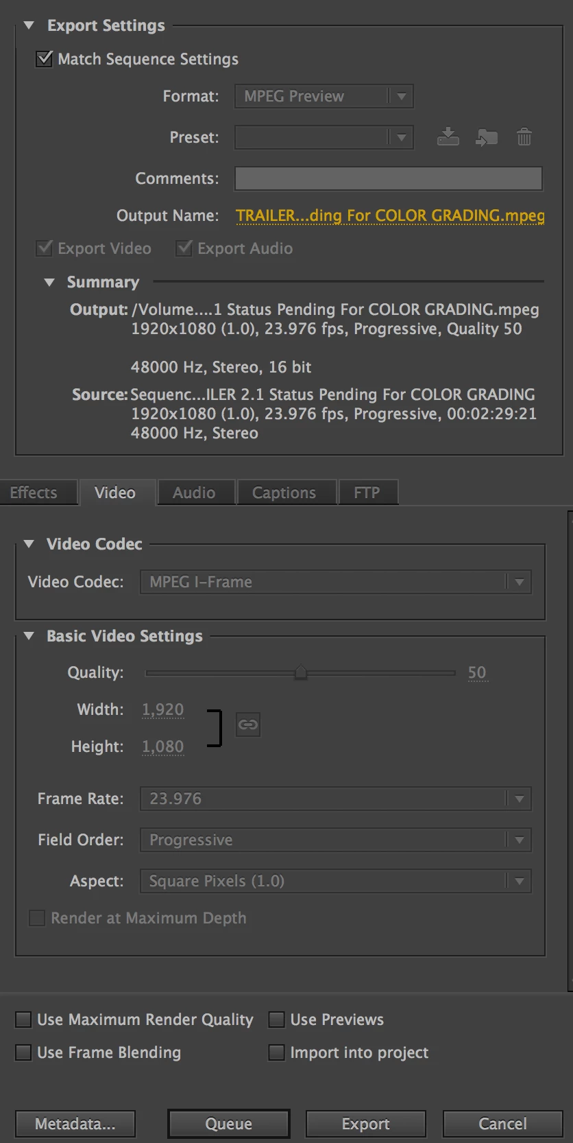 When I try to export to "match settings" – wanting everything full rez, essentially untouched – it says it's in MPEG I mode. Again, attachment.