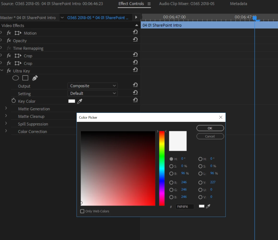 I'm using Premiere Pro vs 12.1.1 (Build 10) on Windows 10. I've applied Ultra Key to a short clip and am attempting to remove a non green background. (#F6F6F6 / R246 G246 B246). I've set the color manually in the Ultra Key Color Picker. The background color persists as if there is no Ultra Key applied. I've reset the Premiere preferences but that had no effect. I've rendered the sequence effects, again no effect. Am I missing something? All the directions and tutorials I've found indicate that this should be working but the background color persists, blocking the background I want to show behind my subject.