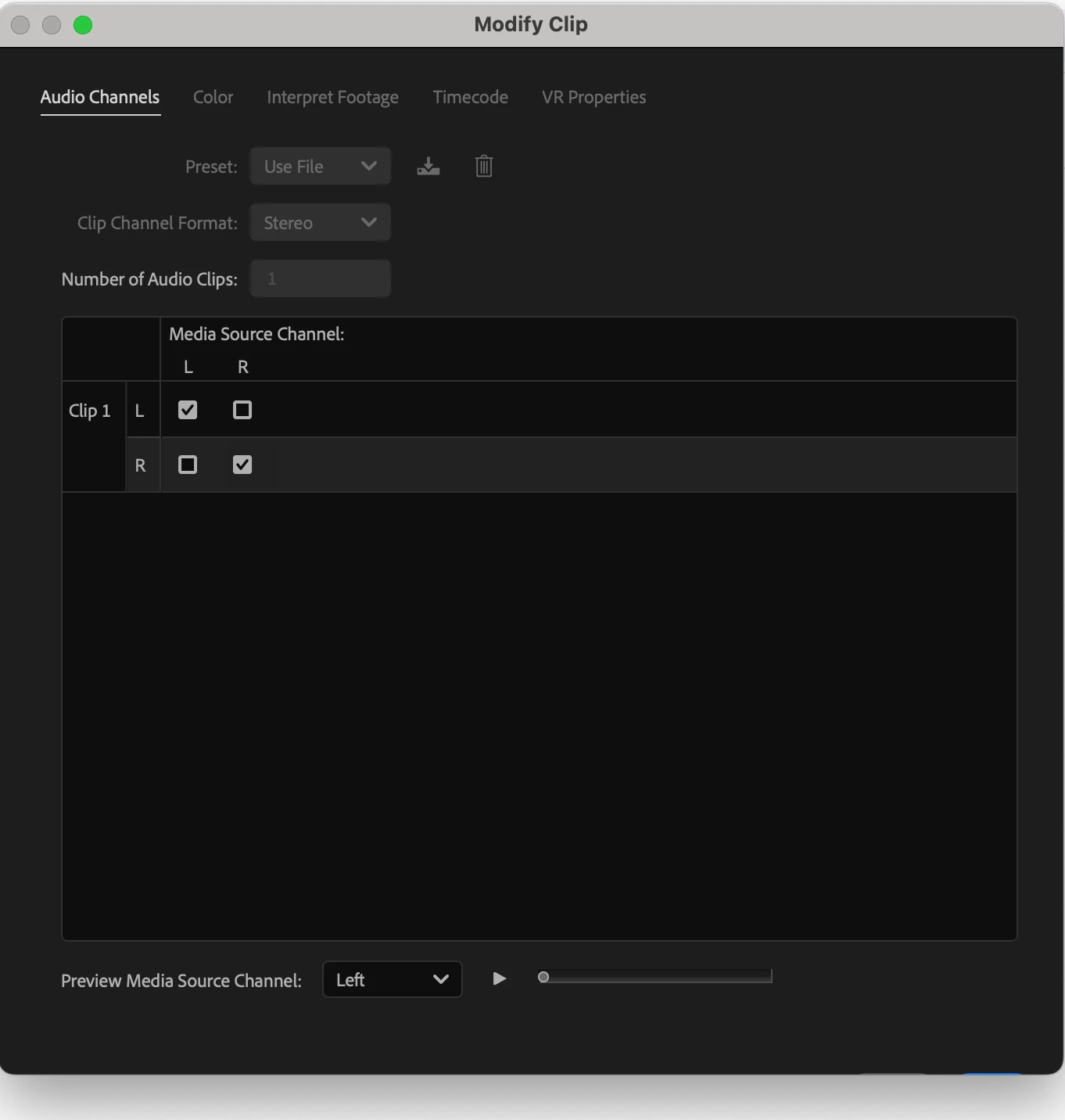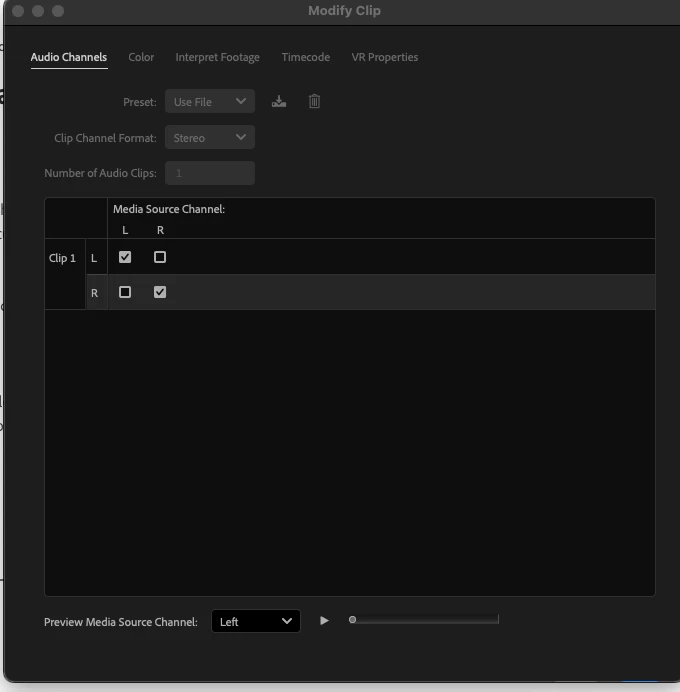 Unable to select audio channel (Modify Clip)