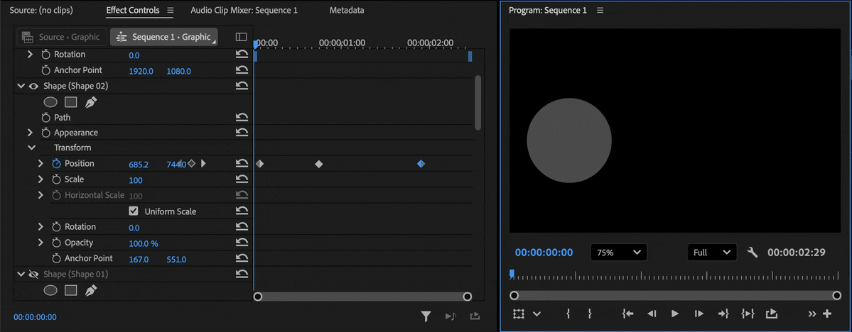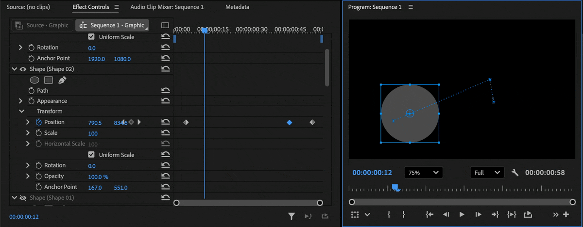 1. First I drag the current time marker along the timeline in the Effect Controls window while watching how the media’s Position keyframes correspond to its visual Position in the Program panel. That shows me where in the timeline the media passes over all segments of the motion path, and what the Position values are at any frame or keyframe.