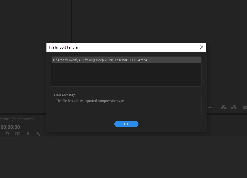 I've tried searching the community for a resolution to this but had no luck! I'm trying to import mp4 files to Premiere Pro 2019 but getting a file import failure notification. I've tried following all the tricks and tips listed so far except for downloading handbrake because that is impractical long term. There was no issue importing the video files 48 hours ago - but now, I get this error. I've tried importing these new mp4s into a project, as well as importing old mp4s that have worked in Premiere Pro previously, but get the same message, so I'm convinced the issue is not with the files themselves.