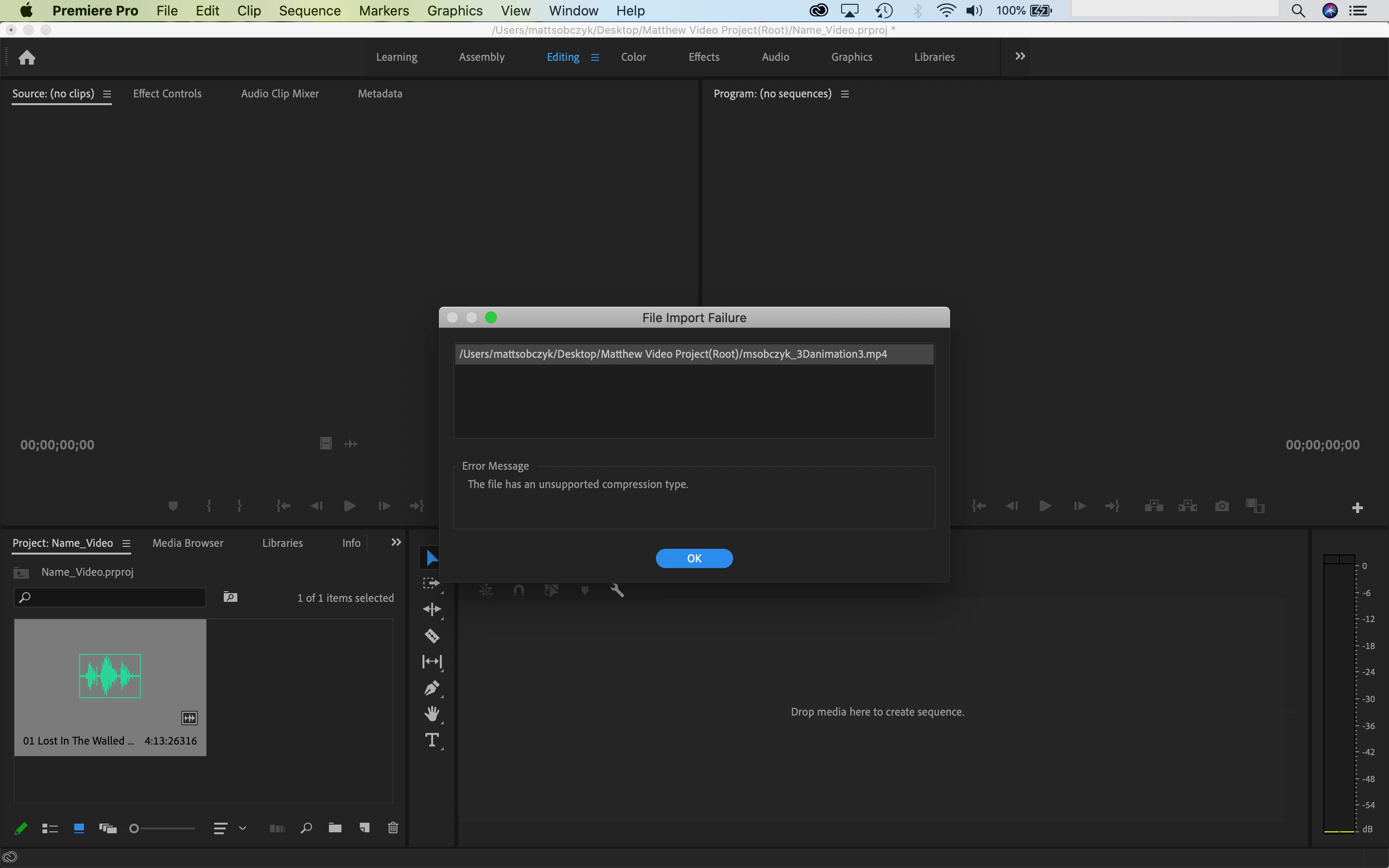 I have Premiere Pro 14.1.0 running on Mac Catalina 10.15.4 and get "The file has an unsupported compression type." no matter what extension for the video clip I'm trying to import. I've emptied media cache etc. (not like there was much there), uninstalled and reinstalled the app, exported teh clip as a .mov through Quick Time and still no luck. This is part of a class assignment and of course I'm the only one who's experiencing this problem.