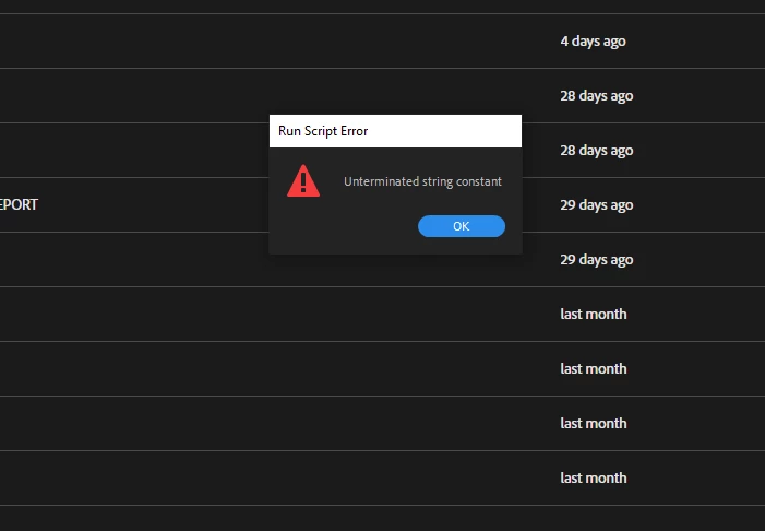 Today when I opened PPr 13.1, I got the above Run Script error. It seems to clear without issue when I click OK, but it is irritating and it shouldn't be there. I updated to PPr 13.1.5 but it hasn't made any difference. I have the same error when I open Ae although it is slightly different and says unable to execute script at line 4. Unterminated String Constant.
