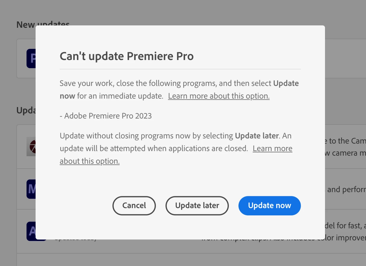 Kkalesh108ParticipantForum|Forum|2 years agoOctober 11, 2023해결됨Update Premiere Pro v24 says V23 Is Open - It's NotForum|Forum|2 years agoOctober 11, 20231 답변330 조회When I choose to update to Premier Pro 2024, it tells me that V23 is open and needs to be closed. But the program is not open. Any ideas how to work around this bug? I can't even uninstall it - I get the same error.User experience or interfacePerformance or Stability