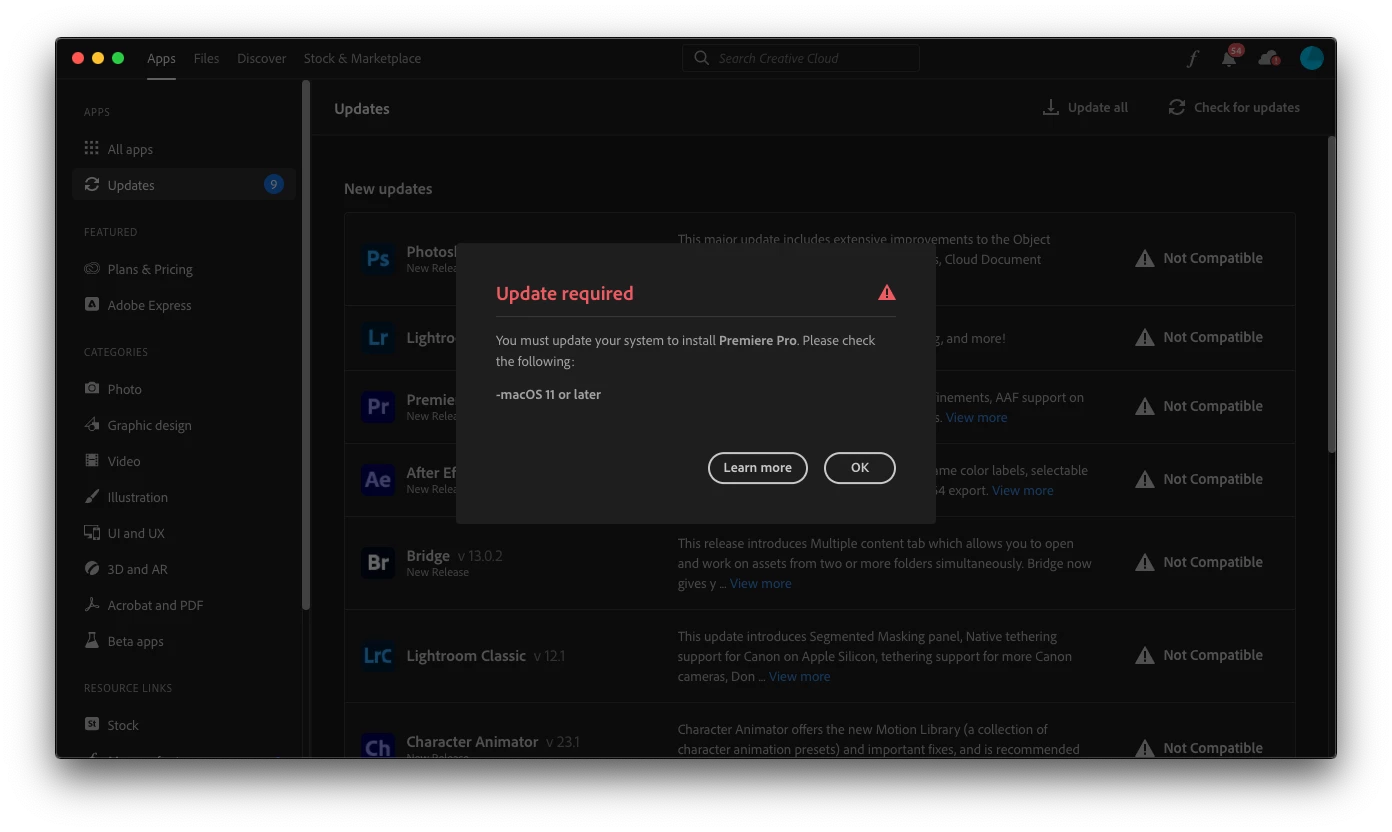 So why isn't it working? I have Premiere Pro 22.6.3 (Build 2) but Adobe Creative Cloud is telling me I cannot update my software any farther even though I am on MacOS 10.15.7 and it says to make sure I am on MacOS 11 or later. I cannot update my OS any farther than 10.15.7 because I am on a 2012 Macbook Pro.