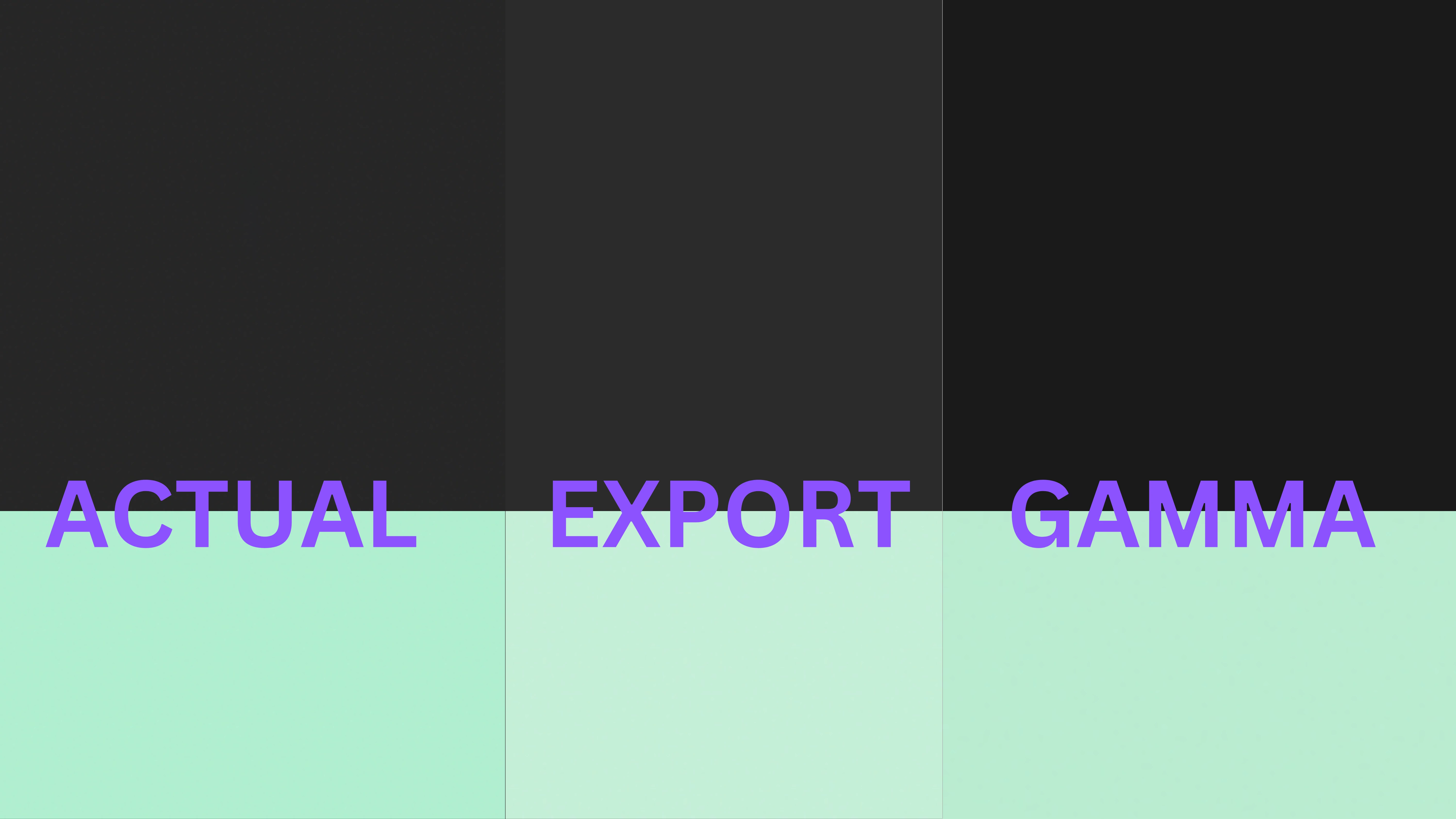 Shown in image the colours prior to export, after regular export, and after export with Gamma Comp.
