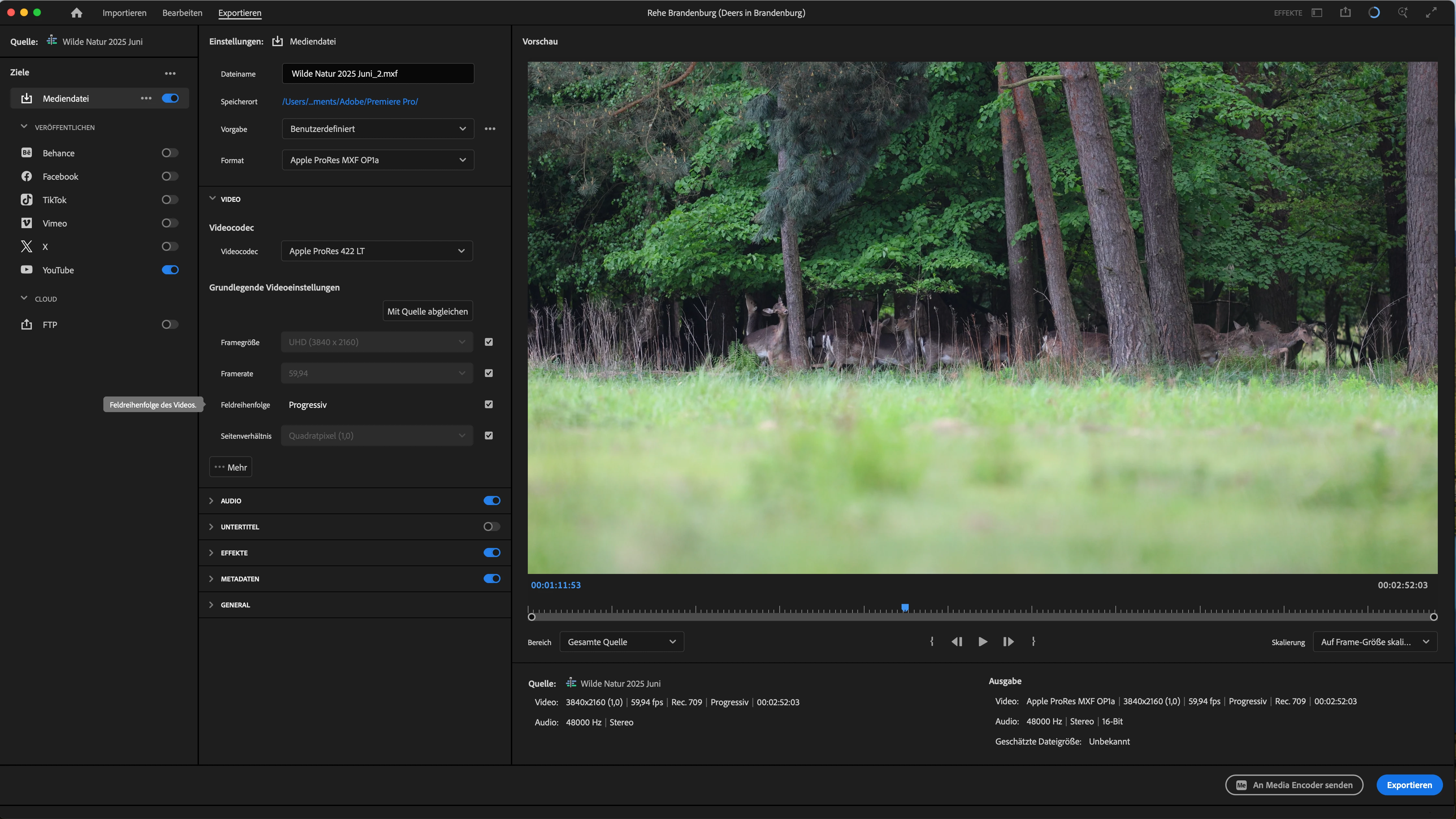 Ich habe ein Video gedreht über die Natur dabei regnet es. Wenn ich es bei Premiere Pro bearbeite dann sietht alles gut aus sobald ich es bei Youtube hochlade flacht der Regen ab trotz Einstelleungen. Ich habe die Ausgabe Einstellungen folgender Maßen eingestellt :H264/3840*2160 (1,0) /Progessiv/Rev 709/203 (75% HLG,58% PQ) Hardware Beschleunigung/00:41:47/ VBR/1 Durchgang/ Ziel 151.80 MBIT´s. Oder habe ich was falsch eingestellt.