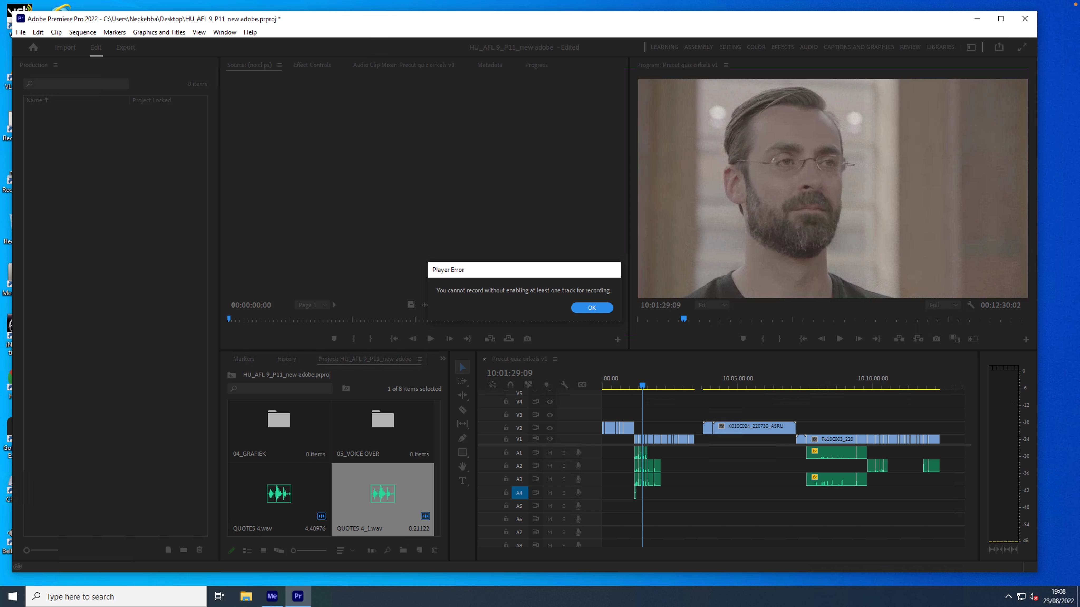 But now on Adobe Premiere 22.4 on PC, that doesnt work any more. He always says: you can not record without enabling at least one track for recording ?? Thats wierd because the track is on, we just used it?