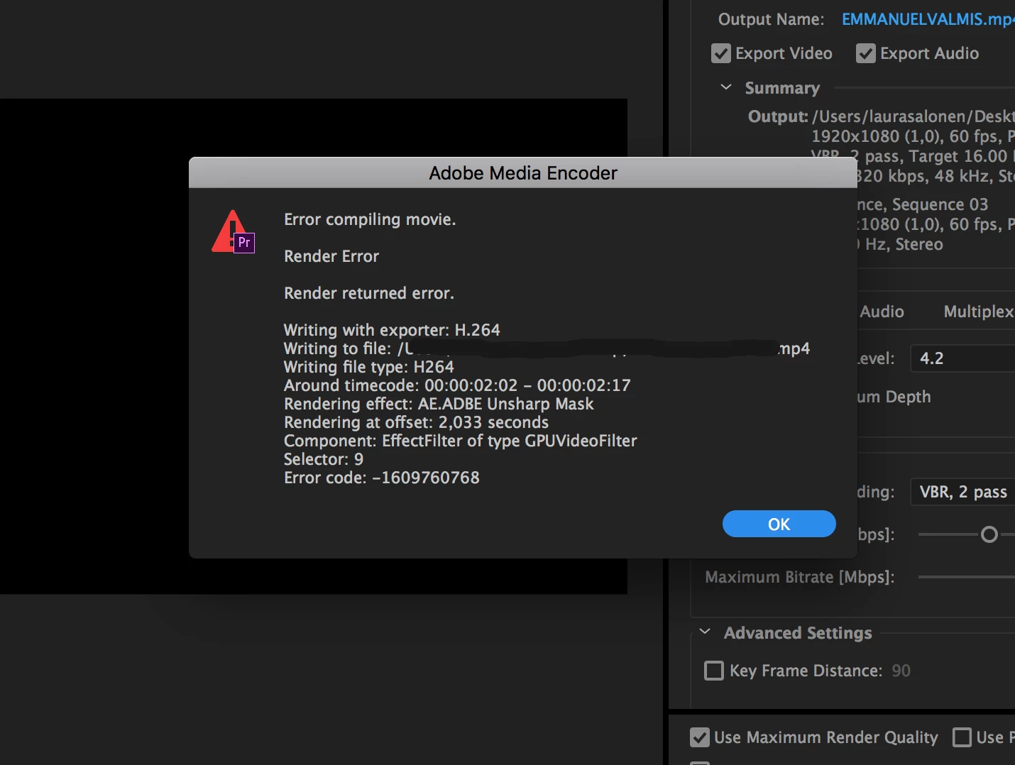 I've been exporting my finished video today to see what gives me the best results. When I was 100% done and started exporting, I got this weird error message. It says something about my Unsharp Masks, so I deleted them all and tried exporting without them, worked fine. Then I added the all over again, and I got this same error message. No other changes made. I have no idea how to fix this and I don't want to upload my video without the unsharp masks. Does anybody know how to fix this?