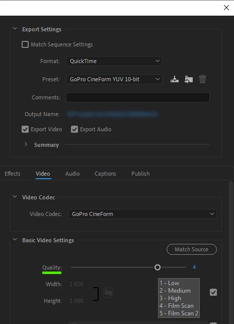 Worth mention is that one have a Quality slider for all CineForm exports. I get  48.4 Mbps when set to 1 (Low) for 1920x1080 25 fps and 124.3 Mbps when set to 5 (Film Scan 2). I started with the GoPro CineForm YUV 10-bit-Preset. I get even larger files if i use any of the 12-bit Presets.