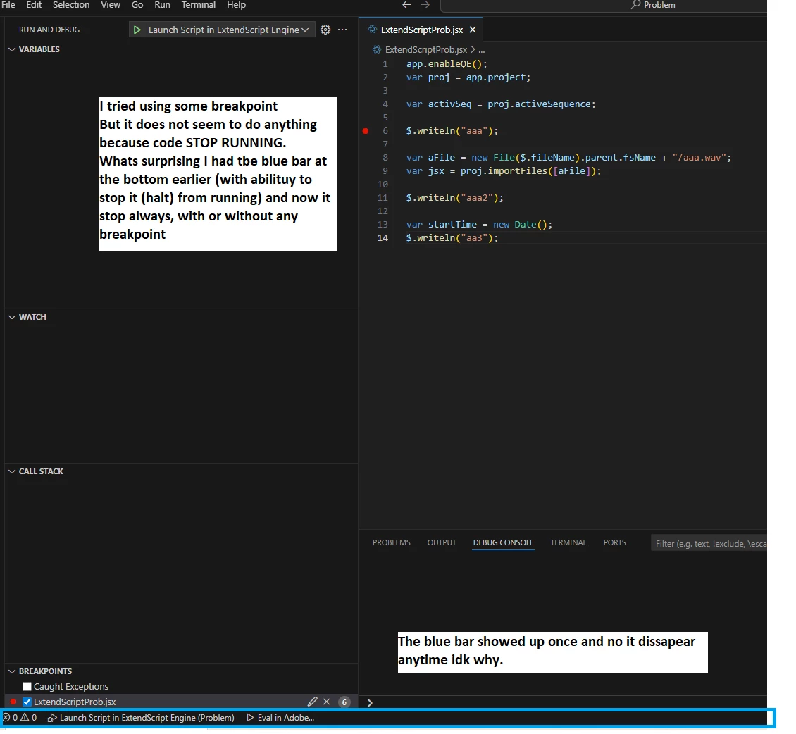 At visual code level I see the usual eval, but only for a split second then it disapears and as i said nothing happened, no prints inside terminal/debug console (from $.writeln() lines) and no effect on current opened ppro project: