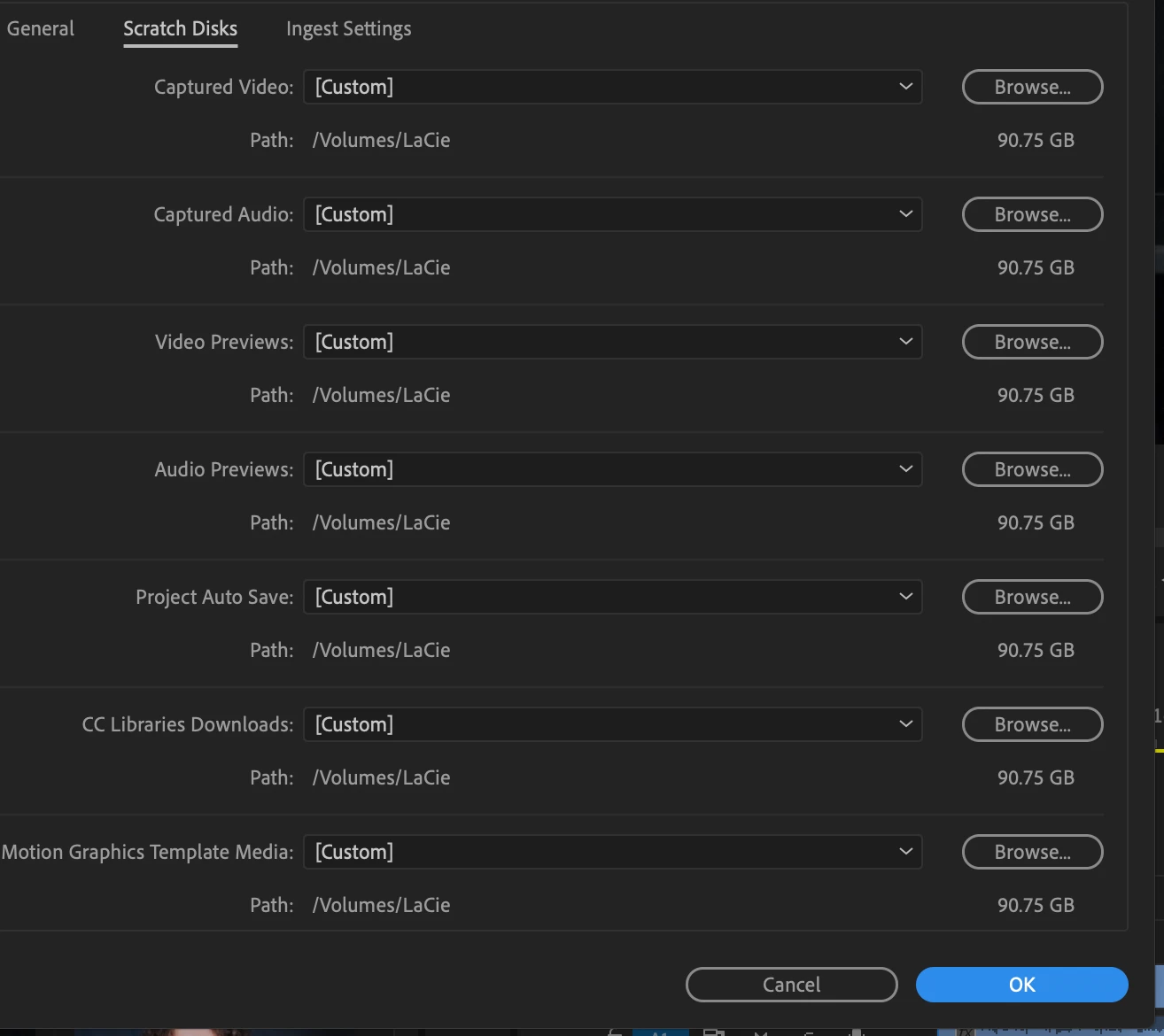 Hi, I've chosen my Lacie to export to, which has about 100 GB available, and have chosen my scratch locations for the same external hardrive. But after a few minutes of exporting, Premiere Pro gives an error message saying disc is full, which obviously it is not.