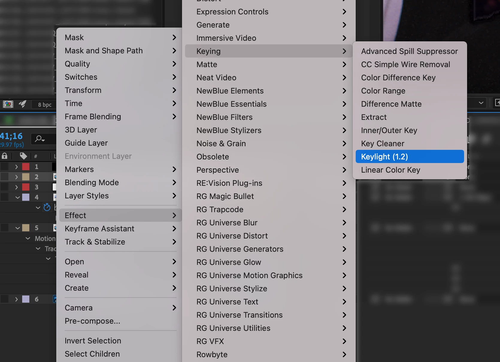 Once in After Effects, right-click the Layer and choose Effects > Keying > Keylight.
